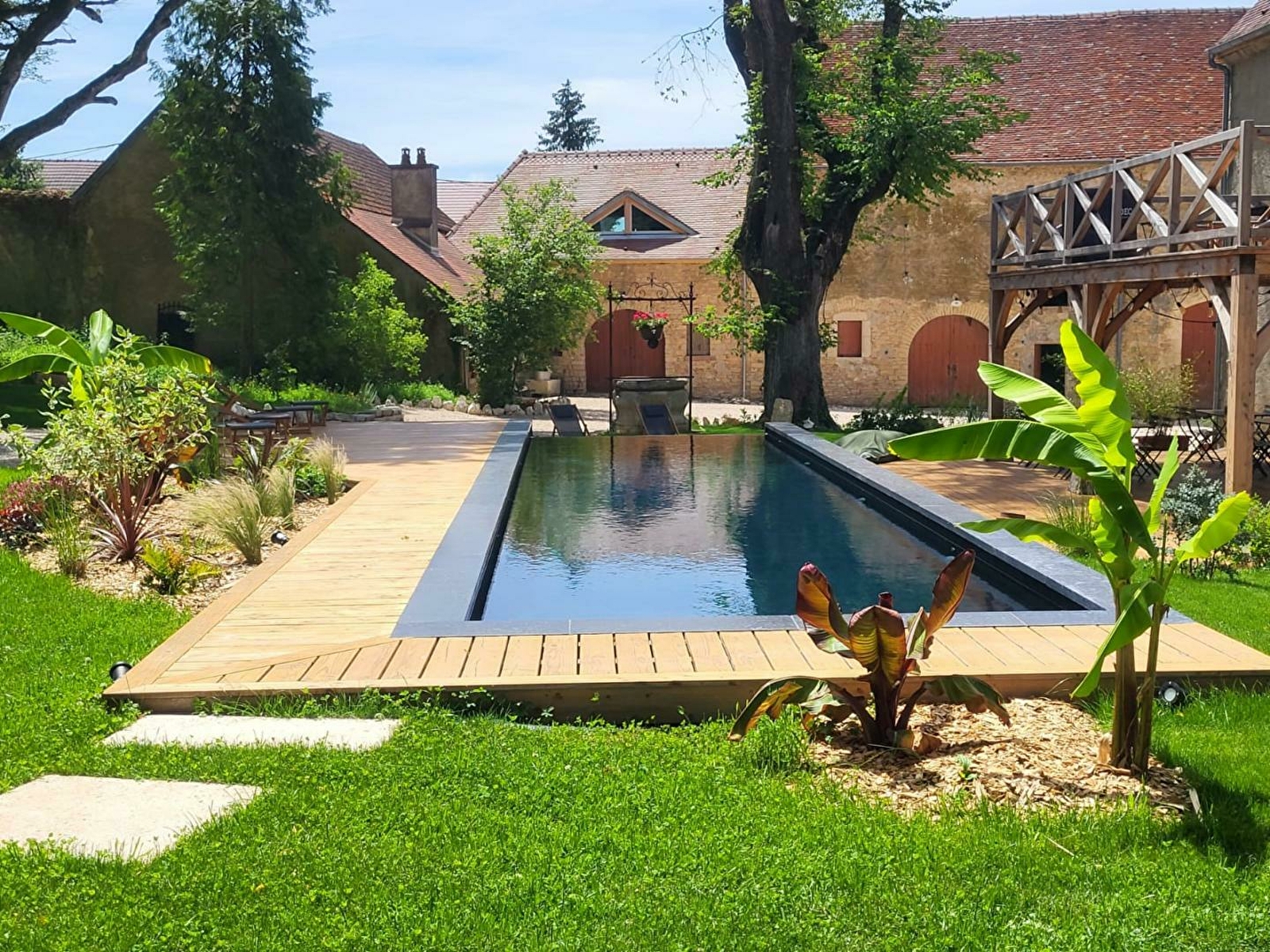 Ancien fief d'une sergenterie des Templiers, cette maison est une bâtisse chargée d'histoire. Rénovée en conservant son caractère et en y ajoutant de la modernité pour vous offrir le meilleur confort durant votre séjour, Nell et Clément, les propriétaires ont mis tout leur cœur et leur énergie dans la restauration de cette maison pour vous offrir une escapade unique, dans un lieu chaleureux et douillet. 3 chambres sont situées au 2ème et dernier étage de la maison : La Mont Roland se compose de 2 lits de 100*100 (ou lit king-size de 200*200) avec baignoire rétro, douche à l'italienne et WC indépendant La Mont Joly avec sa teinte terracotta est équipée d'un lit king-size 180*200, d'une spacieuse douche et d'un WC indépendant La Mont Plumont vous propose 1 chambre avec lit king-size de 180*200, une salle avec douche, un WC indépendant et un espace nuit sous les combles avec 2 lits simples et 1 WC (pièce mansardée, peut convenir à des adultes mais il est possible qu'il faille se baisser un peu à certains endroits. L'escalier pour accéder à la mezzanine est un peu raide et peut ne pas convenir à des enfants trop jeunes.) Et les deux petites dernières : la Cuisance et la Loue, situées dans une annexe de la bâtisse principale et chacune avec 1 lit king size 180*200, une TV, une salle d'eau avec douche et WC indépendant Les serviettes, peignoirs et chaussons sont fournis. Vous prendrez vos petits-déjeuner dans une magnifique salle voûtée où les produits bio et locaux sont privilégiés : boissons chaudes, jus de fruit, viennoiserie, fromage, charcuterie, œufs.... Vous pourrez profitez en toute quiétude d'une terrasse aménagée et ombragée, flânez dans le parc arboré pour aller à la rencontre des animaux (ânesses, chèvres, canards, poules), jouez aux boules et vous rafraîchir dans la piscine (14*3 avec 1.55 de profondeur). Sur réservation : plateau repas et petite restauration - possibilité de privatiser les chambres et l'espace extérieur