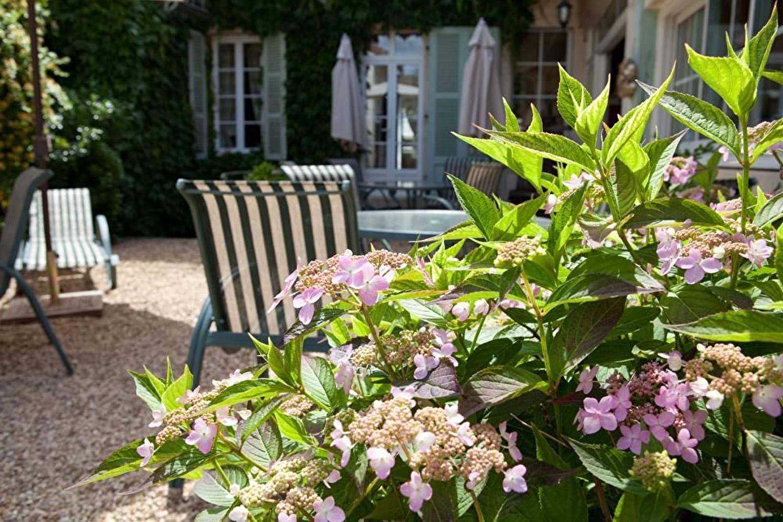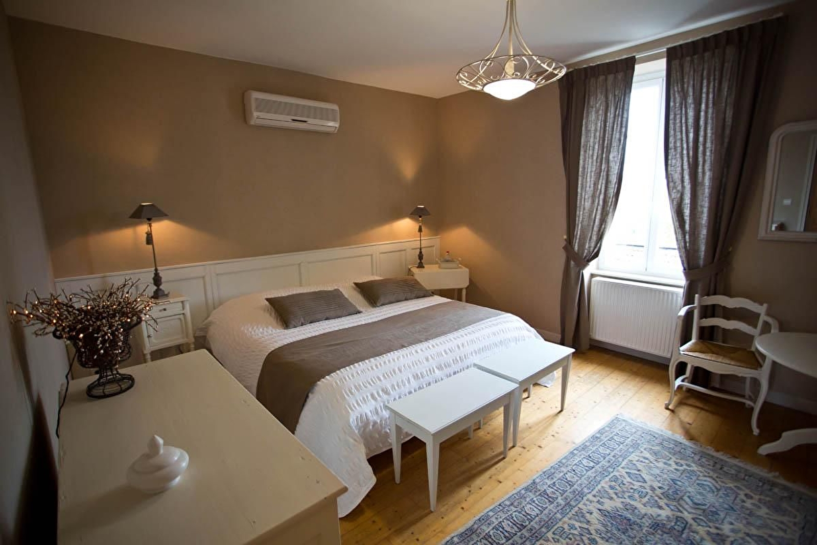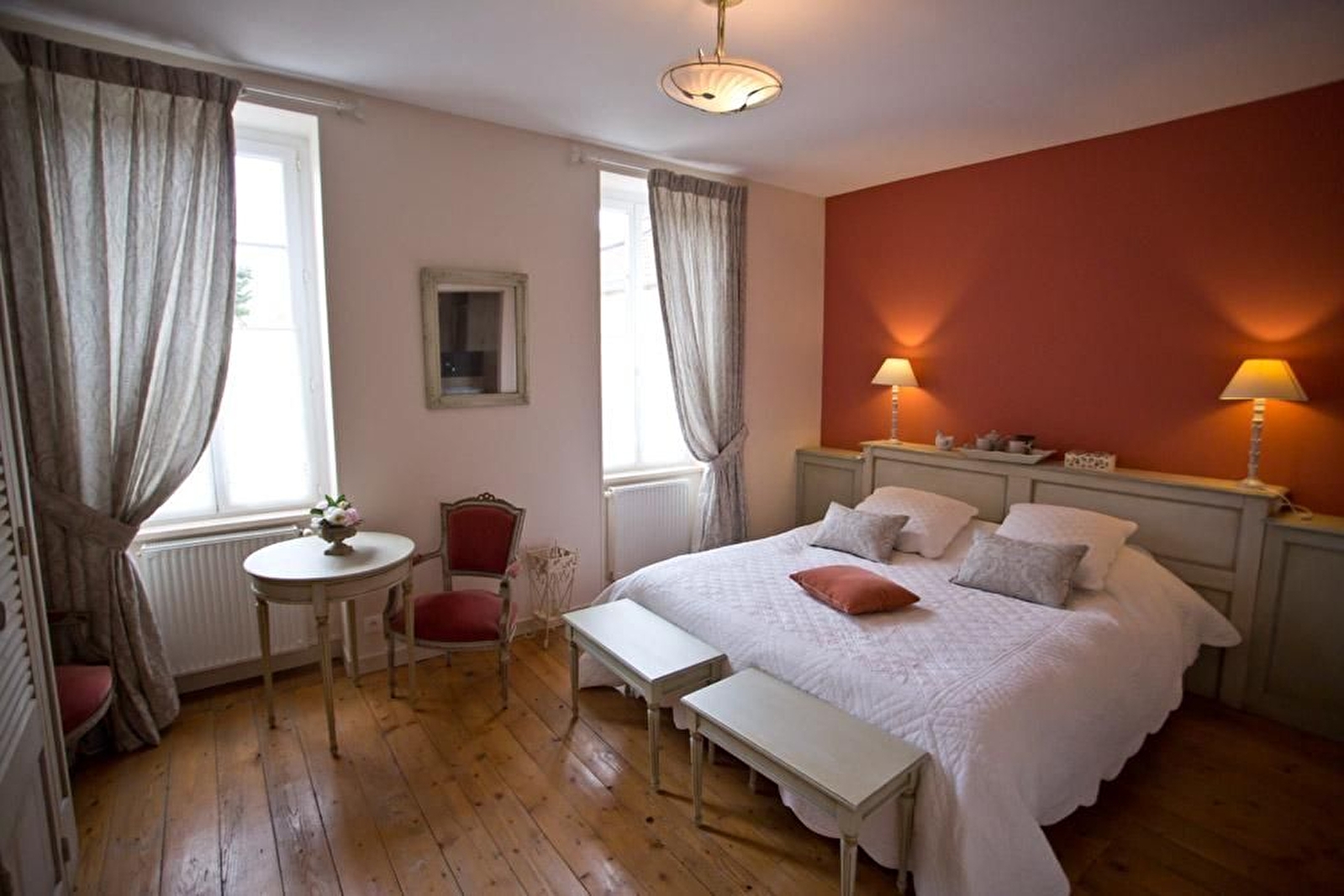 Chambre Pezerolles : Reflets roses et gris pour cette chambre de 16m² pouvant accueillir 2 personnes - lits 2x90x200cm jumélables. Salle d'eau avec grande douche en pierre et WC séparé. Climatisation et plateau de courtoisie, Vue sur la cour intérieure.
