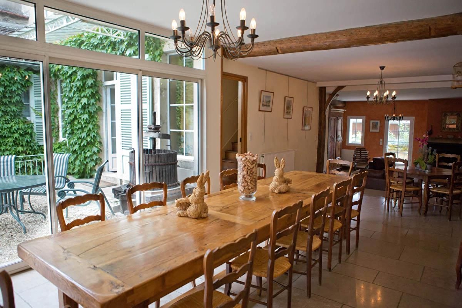 Salon et séjour réservés aux hôtes avec cheminée. Grande cuisine équipée à disposition. Enfant supplémentaire 45 €. Chauffage central. Grande cour et petit coin jardin. Côté vigne, piscine privée à disposition selon horaires. Parking.
