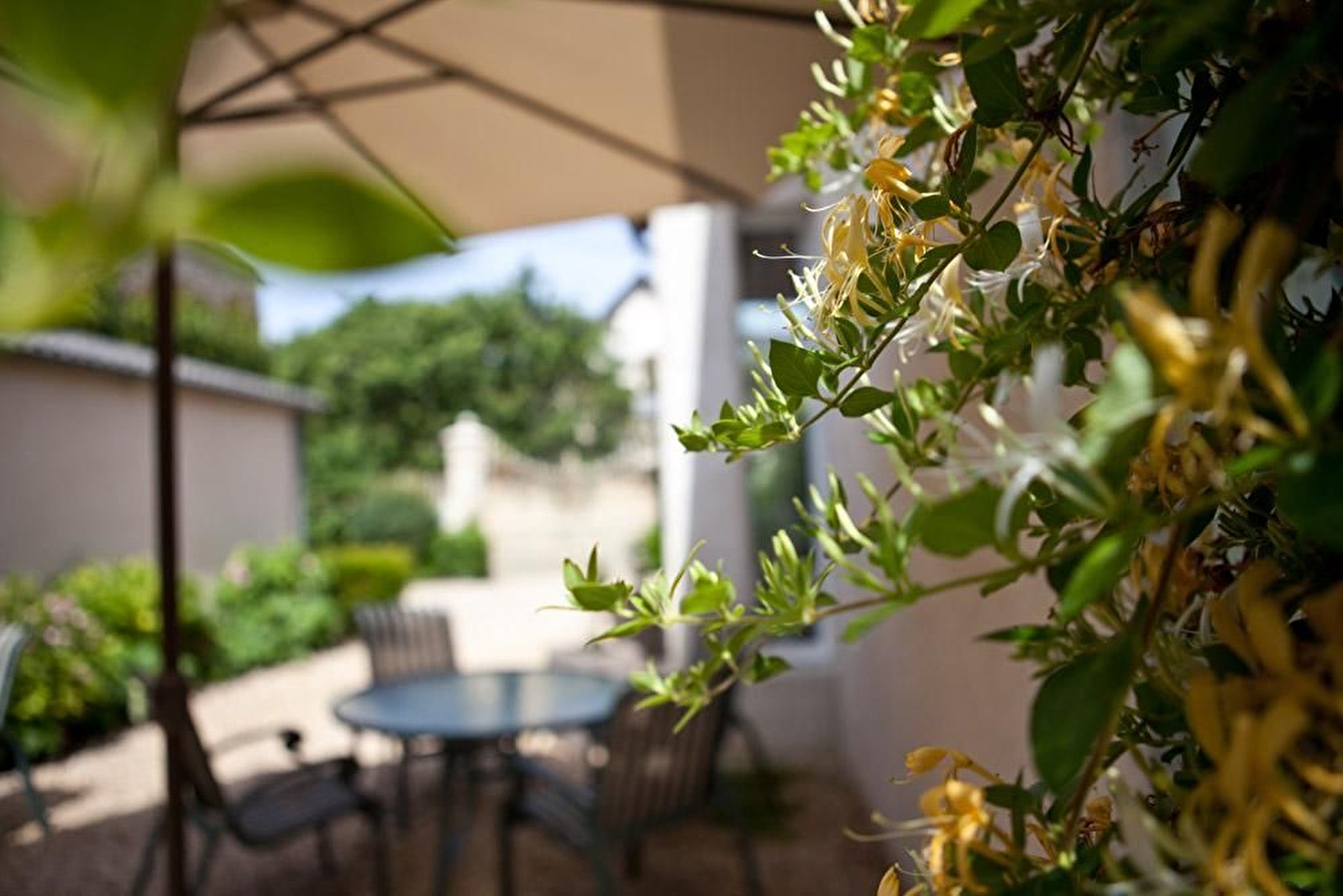 Chambre Clos blanc : Tonalités blanche et taupe pour cette chambre de 20m² pouvant accueillir 2 personnes. Elle est dotée de deux lits 90cm (ou 180x200 cm) Grande salle de bains en pierres et WC séparé. Vue sur la petite cour intérieure et les vignes.