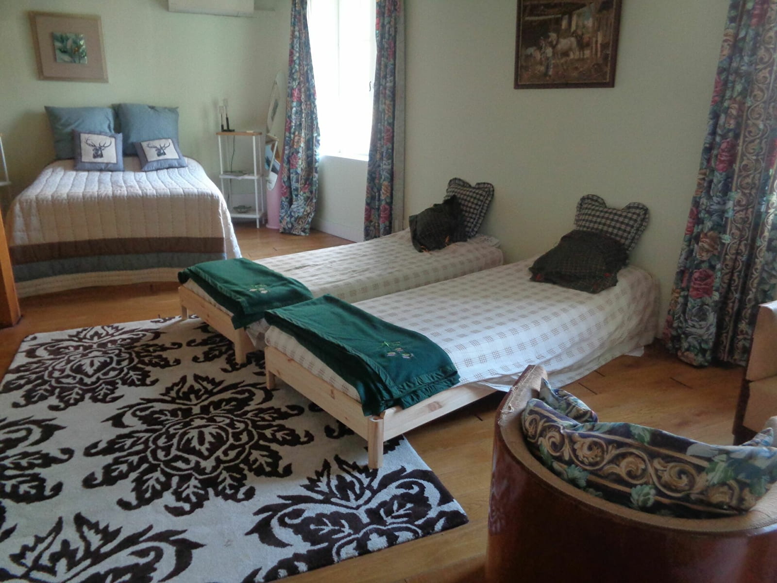 Un grand lit,2 petits lits, clic clac et un lit bébé sont disponibles. Cette chambre comprend un salon avec, fauteuils et petite table.