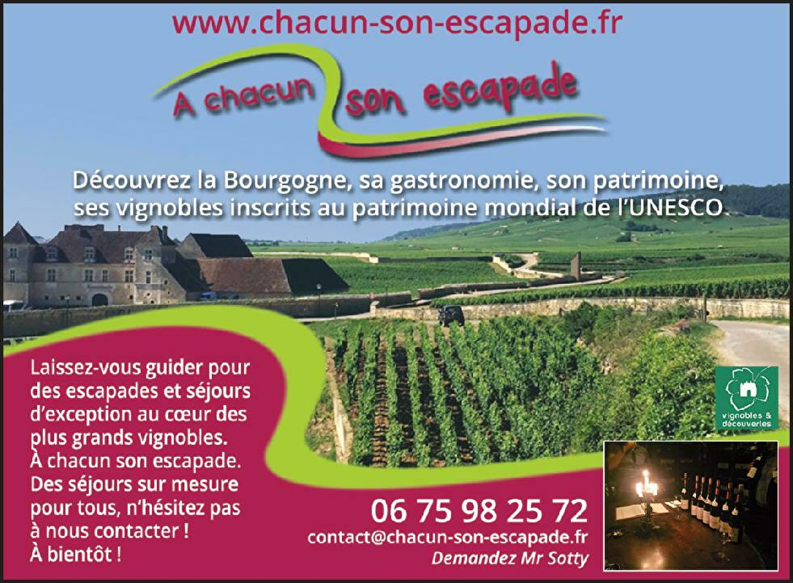 Avec A CHACUN SON ESCAPADE, Bruno SOTTY organise et anime votre accueil afin de vous proposer un séjour inoubliable en Bourgogne.