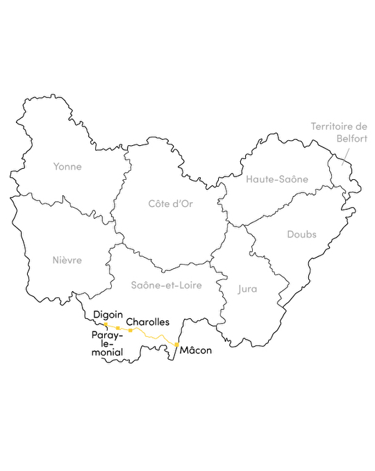 Vous apprécierez le mariage parfait de ces mets d'exception réalisés par les grands chefs locaux sublimés par nos vins du Mâconnais. Embarquez pour une destination de rêve si près de chez vous, avec des étapes à Mâcon, Charolles, Paray-le-Monial, pour terminer votre journée par Digoin. En route !