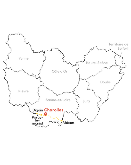 Ce beau parcours traverse le vignoble Mâconnais et le bocage Charolais, en vous faisant passer par Mâcon, Charolles, Paray-le-Monial, et enfin Digoin.