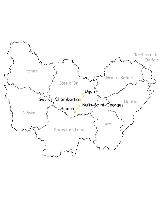 Partez pour un itinéraire épicurien de grand cru à deux pas de chez vous ! Commencez par la capitale de la gastronomie bourguignonne par excellence, Dijon. Puis sillonnez nos vignobles locaux à travers des villages uniques : Gevrey-Chambertin, Nuits-Saint-Georges et enfin Beaune, capitale star de nos vins de Bourgogne.