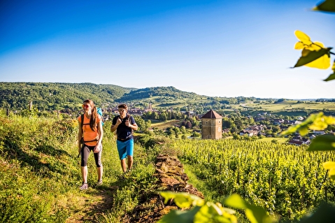 Cette balade vous emmène sur le sentier des vignes, à la découverte des terroirs des corvées et de curon. Ces coteaux pentus aux excellents vins illustrent ce qu'est l'essence de notre terroir jurassien : ensoleillement et altitude idéale, sols caillouteux posés sur des marnes grises profondes, en contrebas d’une corniche calcaire.