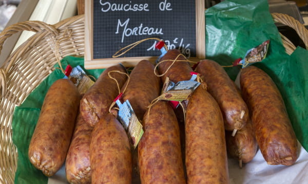 Synonyme de partage et de bonne chère, on distingue la Morteau à sa forme généreuse, sa cheville de bois, sa couleur ambrée et sa texture moelleuse et juteuse. La Montbéliard est la cousine épicée de la Morteau. On la reconnaît à sa forme plus élancée, sa couleur ambrée elle aussi et sa texture ferme.