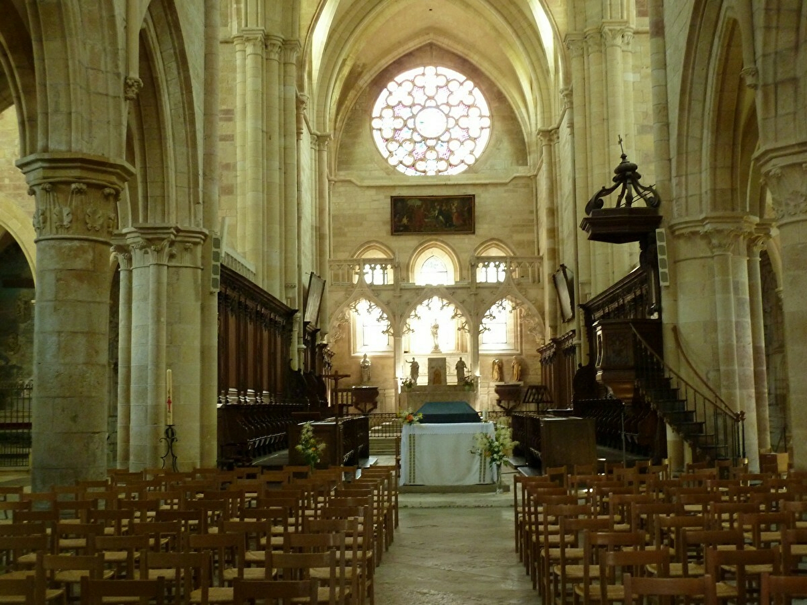 De style gothique bourguignon, elle fut commencée au XIIIe s. et complétée aux XIVe et XVe s. sous trois abbés dont Jean de Blaisy et Pierre de Fontette dont on peut voir les pierres tombales dans l'église (le premier représenté sous forme de squelette, le second paré des ornements épiscopaux). Le portail est orné d'un décor végétal typiquement bourguignon. Le magnifique jubé en pierre ciselée (XIVe s.) qui se trouvait plus avant dans la nef a été remonté dans le choeur où l'on peut voir d'élégantes stalles Louis XV. Les exceptionnelles peintures murales illustrent au nord la légende de saint Seine en 22 tableaux (1504) et au sud l'arbre de Jessé, saint Christophe et des litanies de la Vierge dans un style influencé par la Renaissance.