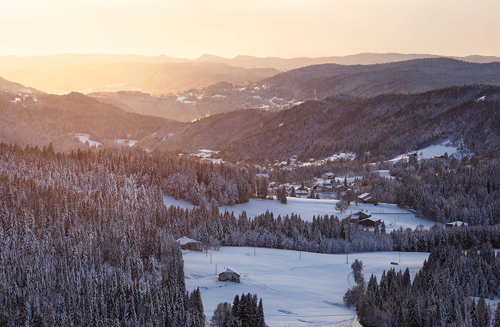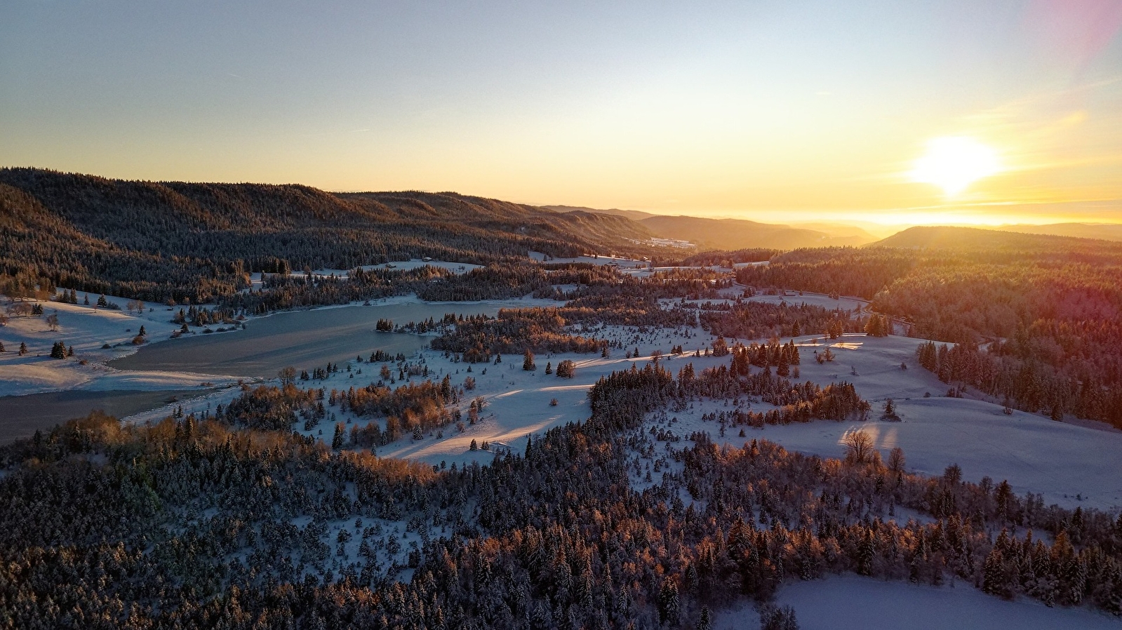 Reflet du ciel, fond vert clair des pâturages, roux des tourbières et vert sombre des boisements...
