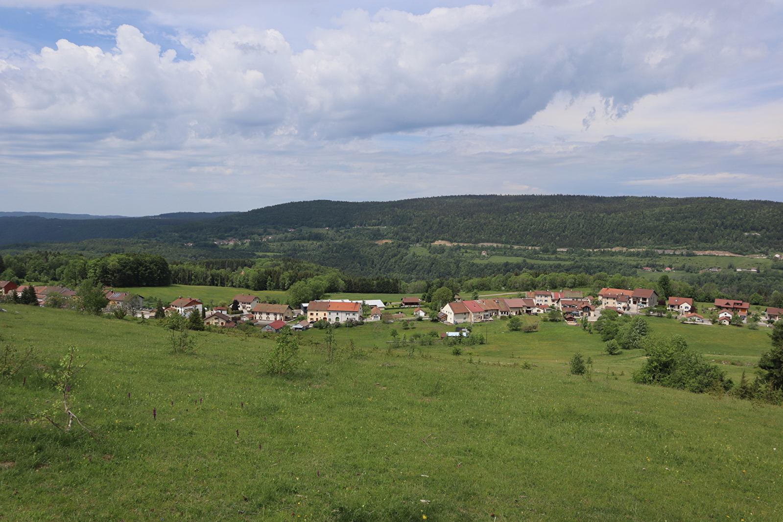 Depuis l’église visible à l’extrémité sud du point de vue, les bâtiments s’échelonnent le long des routes entre fermes et hameaux. Les boisements occupent les pentes, surplombant la mosaïque de prés et de bosquets de la vallée.