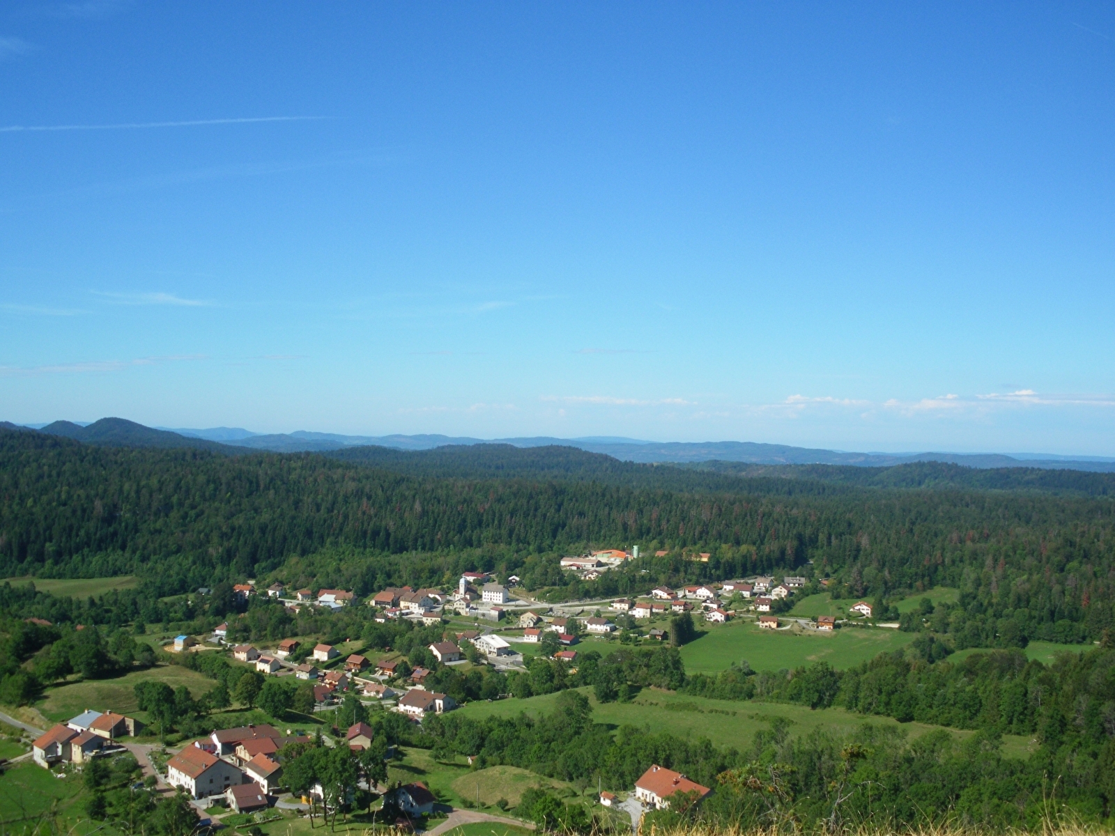 Magnifique belvédère avec vue sur la chaîne du Haut-Jura et le village des Crozets. Table de lecture de paysage. Accessible à pied (plus d'informations dans le cartoguide de randonnées Jura Sud).