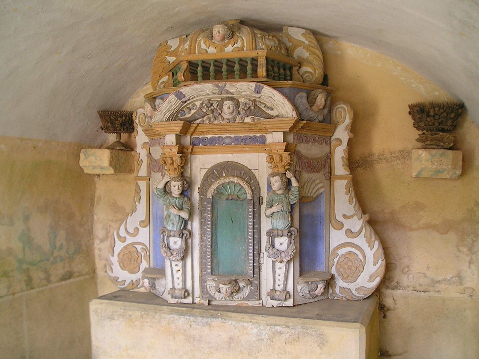 Dans les niches du retable, les statues sont absentes par mesure de sécurité.