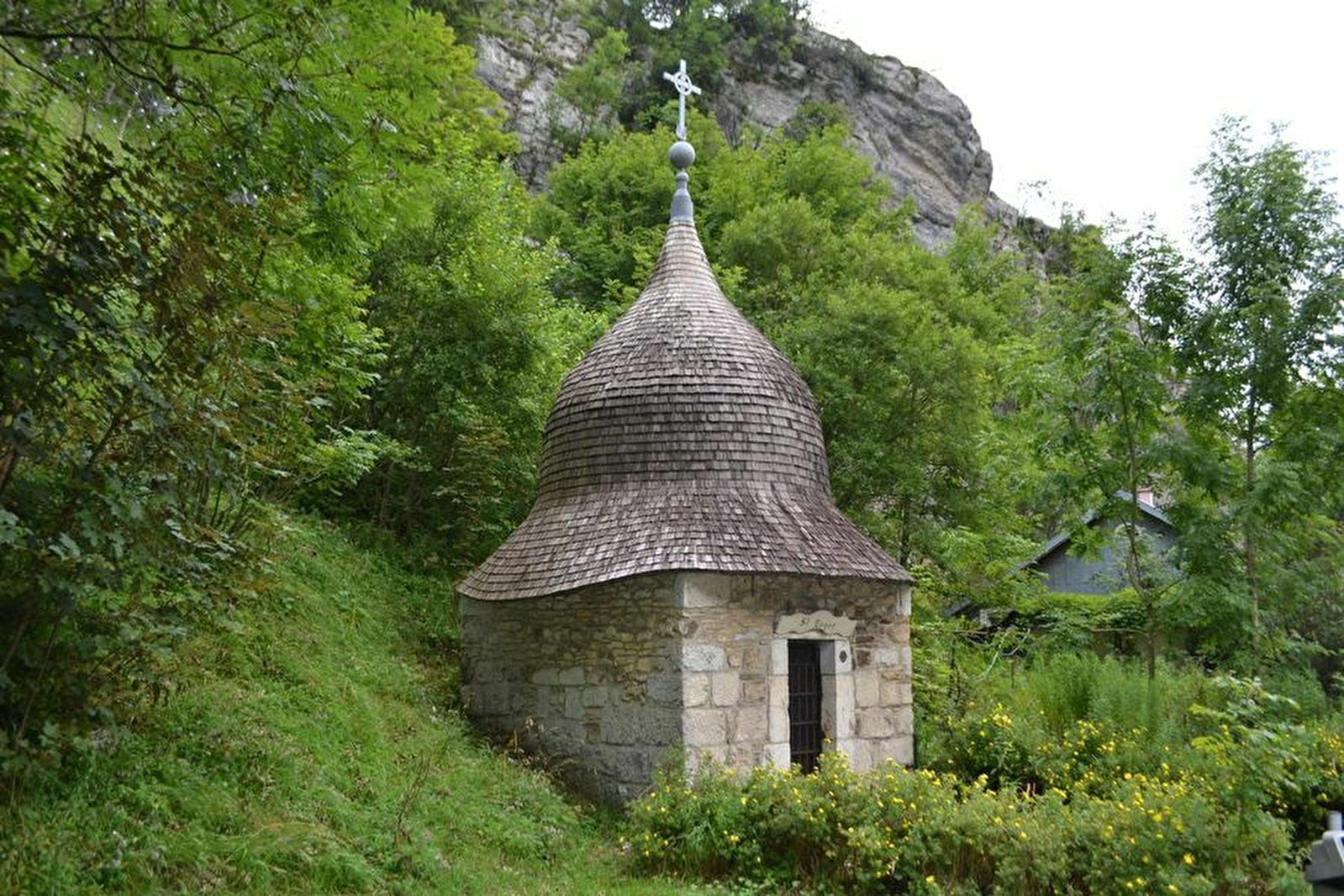 Ce petit oratoire de forme carrée est construit de pierre ornée d’un petit clocher comtois à l’impériale, en tavaillon.