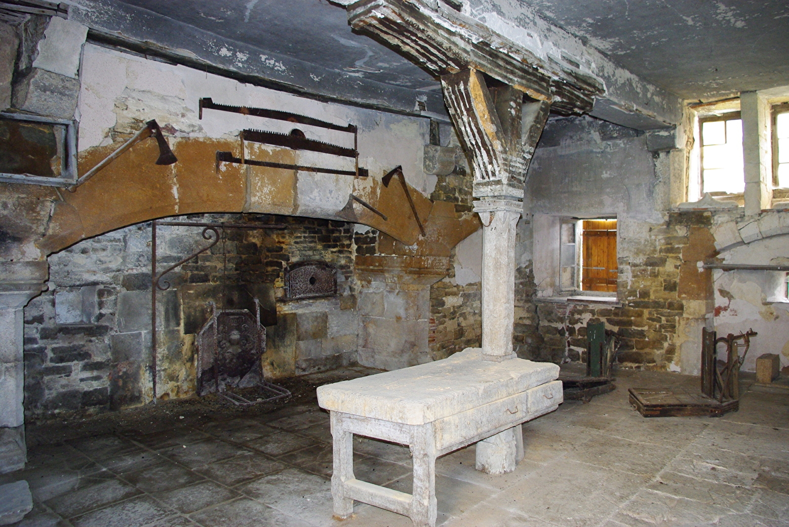 - L'aile Ouest est essentiellement médiévale, mais son balcon et les fenêtres de la façade Sud ont été ajoutés au XVIIIe et le clocheton zingué vers 1870, comme l'atteste une gravure de l'époque. Cette aile comporte une cuisine du XIIIe siècle en remarquable état de conservation ainsi qu'une charpente en berceau datant de 1430.