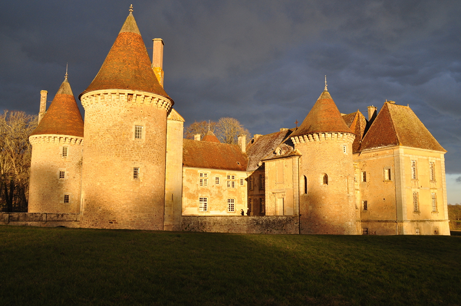 Deux lions de pierre gardent la grille précédée d'un pont. Quatre tours rondes (XIVème siècle) protègent le corps du logis (XVème, XVIIIème siècle) percé sur la façade de la cour de fenêtres à meneaux en opposition aux nombreuses ouvertures sur la façade extérieure. Le gentilhomme satirique Roger de Rabutin (Histoire amoureuse des Gaules), cousin de Madame de Sévigné y naquit en 1618.