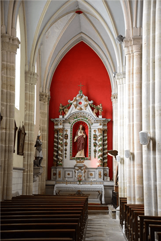 Le cimetière a été déplacé hors du village en 1843 pour permettre cette extension. Cette mutation importante de l’édifice se caractérise tout d’abord par le choix du style gothique en cohérence avec la partie d’origine, par l’abandon de l’orientation du chœur vers l’Est pour privilégier l’ouverture au village, enfin, pour des raisons économiques, par la solution technique d’une structure bois recouverte de plâtre pour les arcs et les voutes. Ajoutons que cette structure légère permet un espace généreux et une grande sobriété du bâtiment à l’extérieur (absence de contreforts), par une lumière abondante qui se répand dans les trois nefs largement ouvertes.