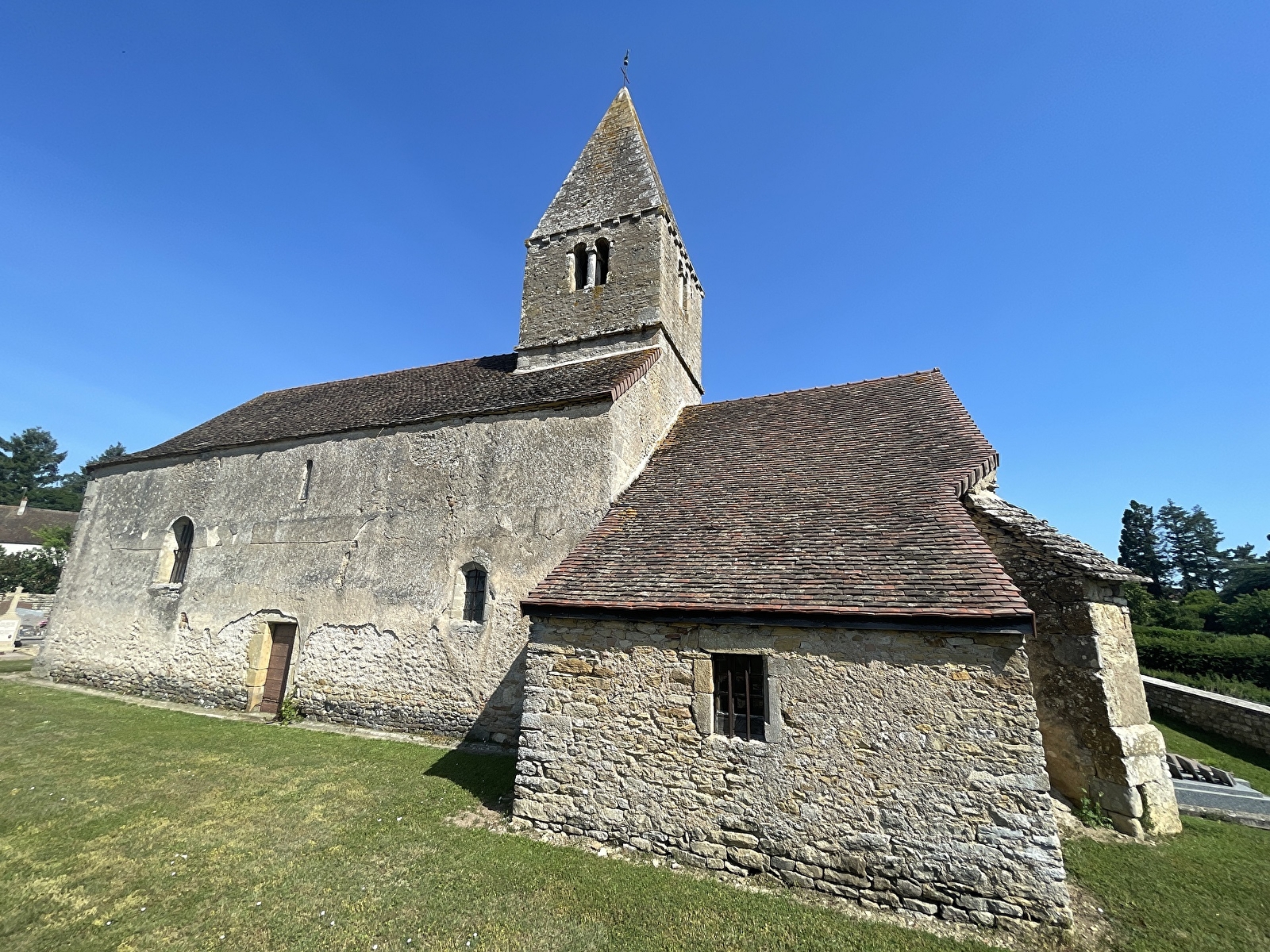 La meilleure façon d’aborder cette église semble être de la découvrir depuis la route venant de Germagny. L’église se compose de deux parties : à gauche un bâtiment rectangulaire d’où émerge à droite (côté est) le clocher sur plan carré. De ce côté est accolé un bâtiment plus bas, mais débordant en largeur, éclairé par une grande fenêtre dans l’axe de l’église : sans doute un choeur plus tardif.