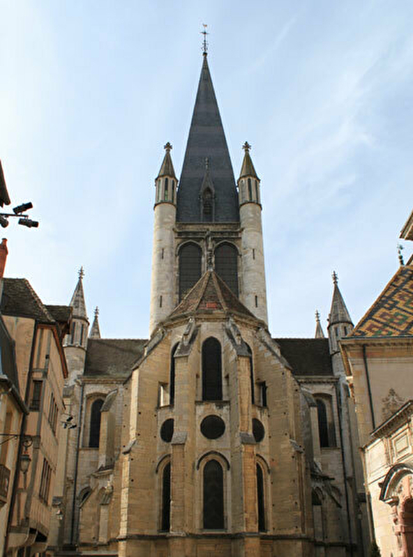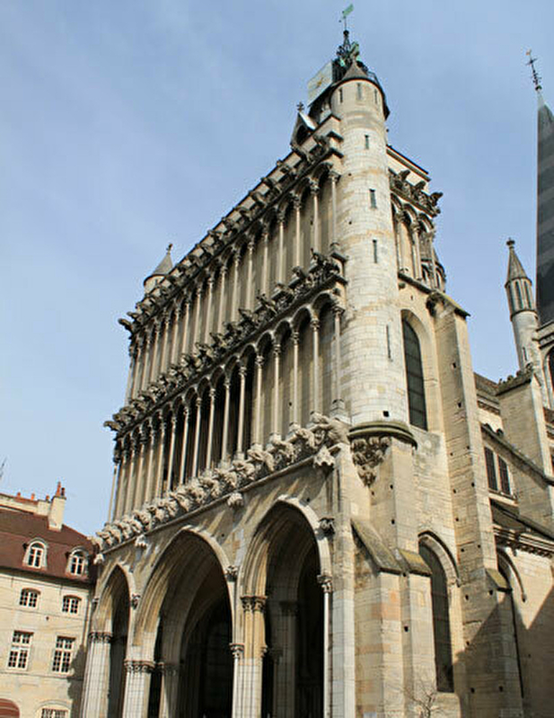 Avec son haut portail surmonté d'une double rangée d'arcades à fines colonnes et ses proportions harmonieuses, elle est un chef d'oeuvre du gothique bourguignon construite en 20 ans (1230-1250). Au sommet de la tour sud, le Jacquemart, horloge composée d'une cloche et d'un automate est un cadeau de Philippe le Hardi qui le confisqua aux Flamands de Courtrai. La Vierge noire du XIe s. endommagée à la Révolution fait l'objet d'un culte important tandis que la chouette sculptée sur un pilier nord à l'extérieur de l'église est devenue un porte-bonheur.