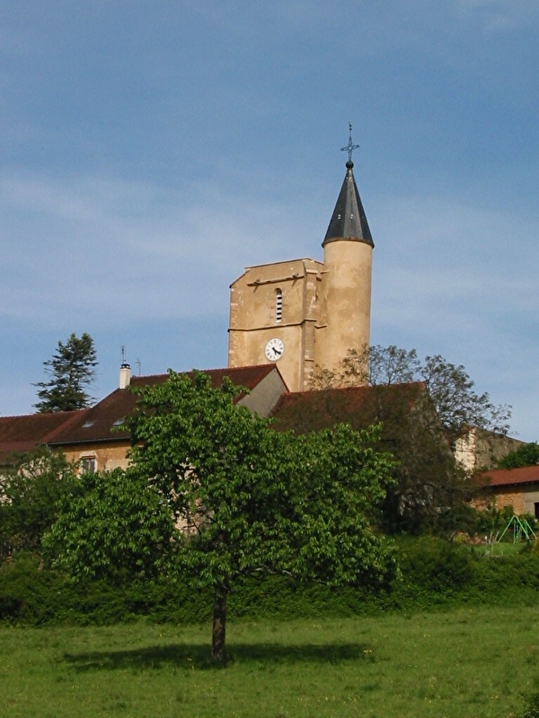 Le clocher est composé du beffroi et de la tour ronde avec des escaliers à vis qui mènent à la terrasse. On peut y voir une vue panoramique sur les Monts de Bourgogne et le Revermont. Le clocher compte 3 cloches. Une des cloches est plus récente car lors des guerres de Prusse en 1870, l’une d’elle a été fondue pour faire de l’armement, il a donc fallu la remplacer. Celle-ci vient d’une fonderie Annecienne et date de 1954.