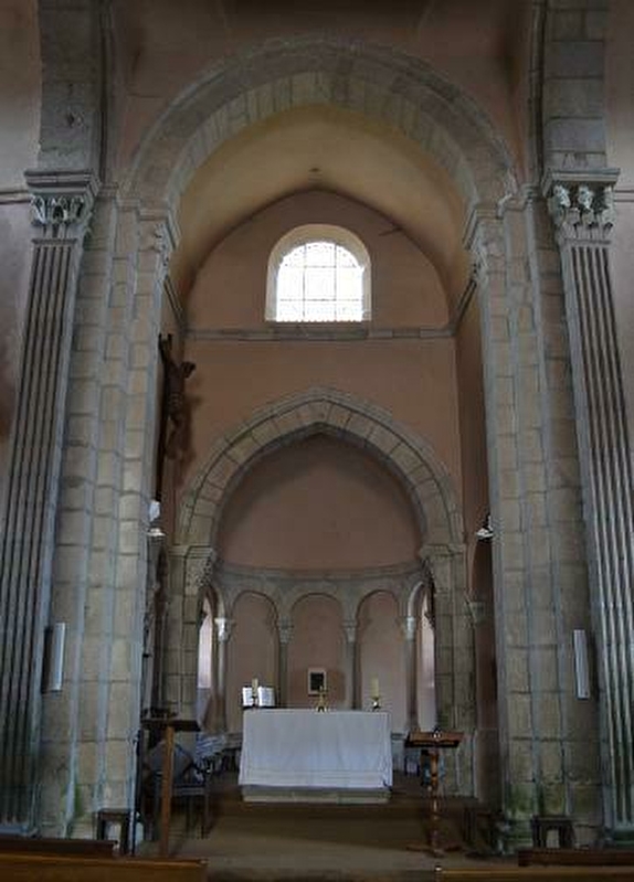 L’intérieur est encore roman. La nef compte trois travées avec des collatéraux. Les voûtes romanes n’existent plus, elles ont été remplacées par des plafonds plats. On peut supposer que la nef était voûtée en berceau brisé sur doubleaux à l’origine et que des arêtes couvraient les bas-côtés. Les piliers carrés, flanqués de pilastres avec impostes et chapiteaux, sont encore debout. Ils supportent les grandes arcades en plein cintre marquant le seul étage en élévation. Les bas-côtés, également plafonnés, ont des murs avec des baies et des pilastres avec chapiteaux sans décor. Le transept s’élève sur quatre piliers cruciformes cantonnés de pilastres dont ceux à l’est sont de profil cannelé. Des arcs brisés à double rouleau supportent la coupole sur trompes qui a été refaite. Les croisillons, voûtés en berceau brisé, s’ouvrent vers les bas-côtés par des arcs brisés avec impostes. Le chœur en granit rose est la partie la plus ornée de l’église. La travée droite, également voûtée en berceau brisé, conserve deux arcatures avec pilastres cannelés du côté nord. L’abside en cul-de-four possède deux baies et sept arcatures en plein cintre sur colonnettes de granit avec chapiteaux. L’arc triomphal, de profil brisé, retombe sur deux pilastres cannelés avec chapiteaux. Au sud se trouve la chapelle seigneuriale Saint-Hubert, de style gothique, avec une voûte en ogive et la châsse du saint.