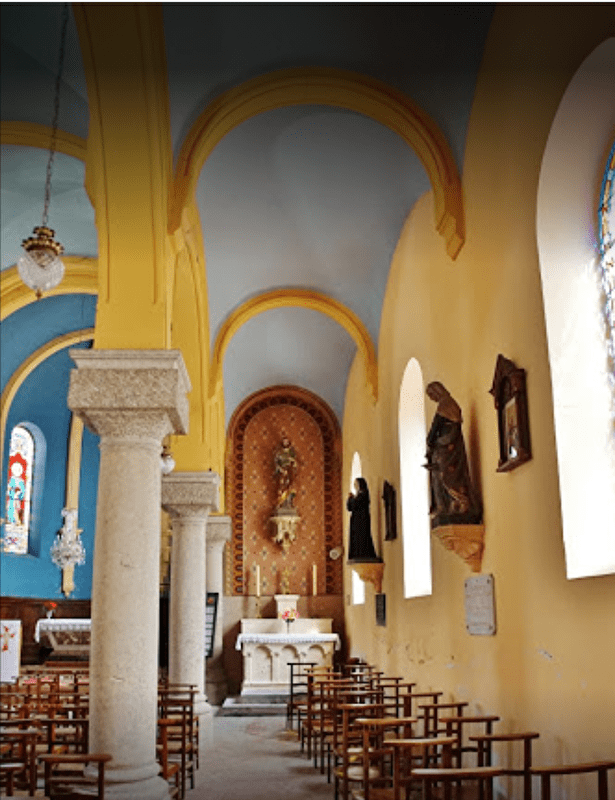 Les colonnes monolithiques séparant les bas côtés de la nef reposent sur des bases octogonales, les chapiteaux sont de pierre brute martelée. Dans le chœur les arcatures reposent sur des chapiteaux à motifs végétaux stylisés.