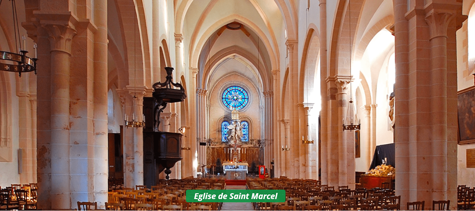 Un petit oratoire fut probablement édifié sur la tombe de saint Marcel, fondateur de la foi chrétienne en Bourgogne, à qui l'église est dédiée.