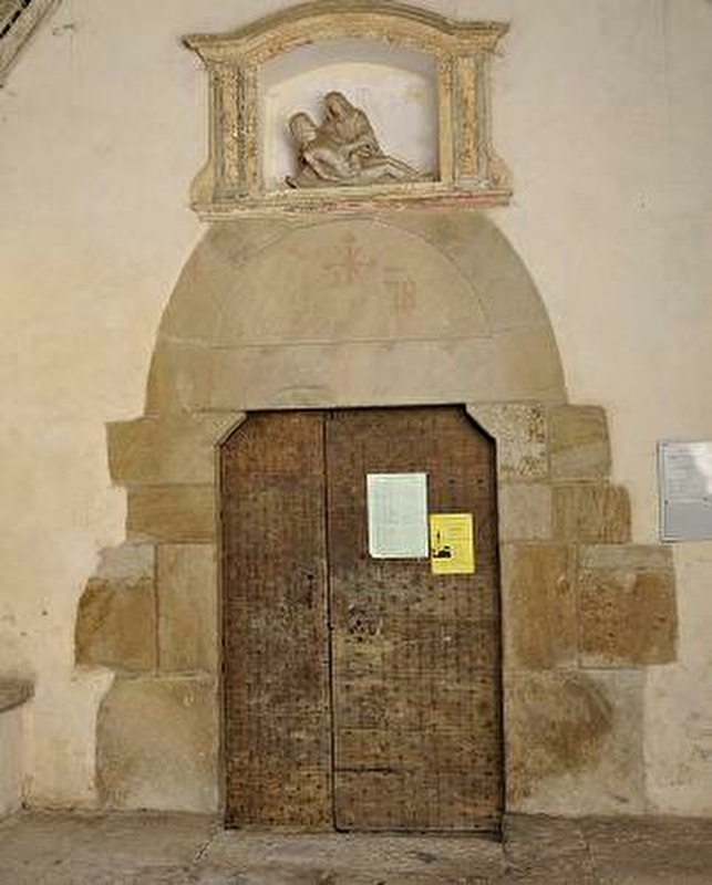 La façade occidentale est percée d’une porte protégée par un petit porche et surmontée d’une niche Renaissance à ailerons et linteau en cintre surbaissé ; dans cette niche se trouve une Pietà du XVe s. ; la façade est contrebutée par deux contreforts.