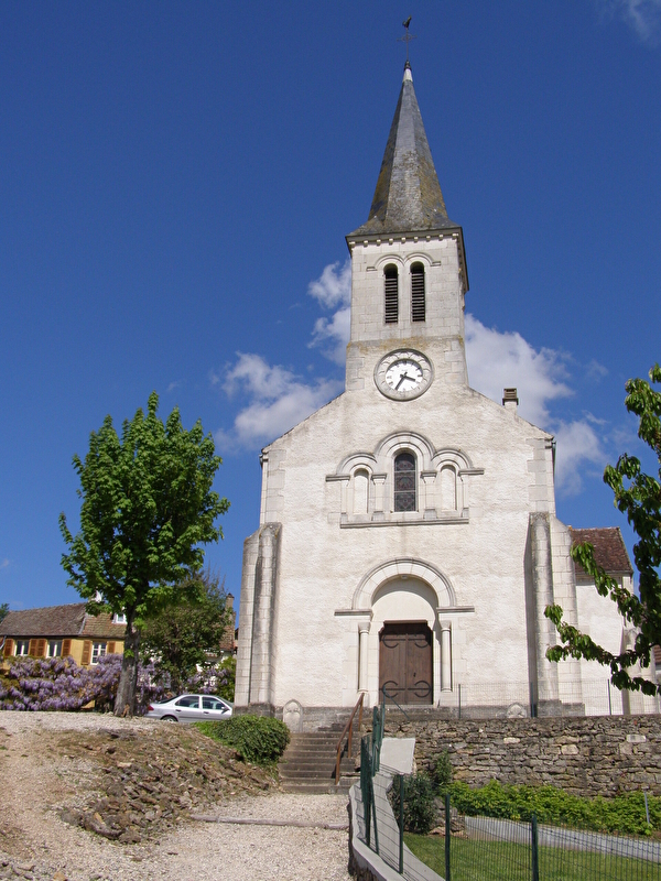 Le style est néo-roman. La façade ouest dominée par un élégant clocher est ornée d'une arcade triple, l'arc central étant percé d'une fenêtre. Le portail encadré de colonnes dégagées avec des chapiteaux martelés, est surmonté d'un tympan vide de toute sculpture.