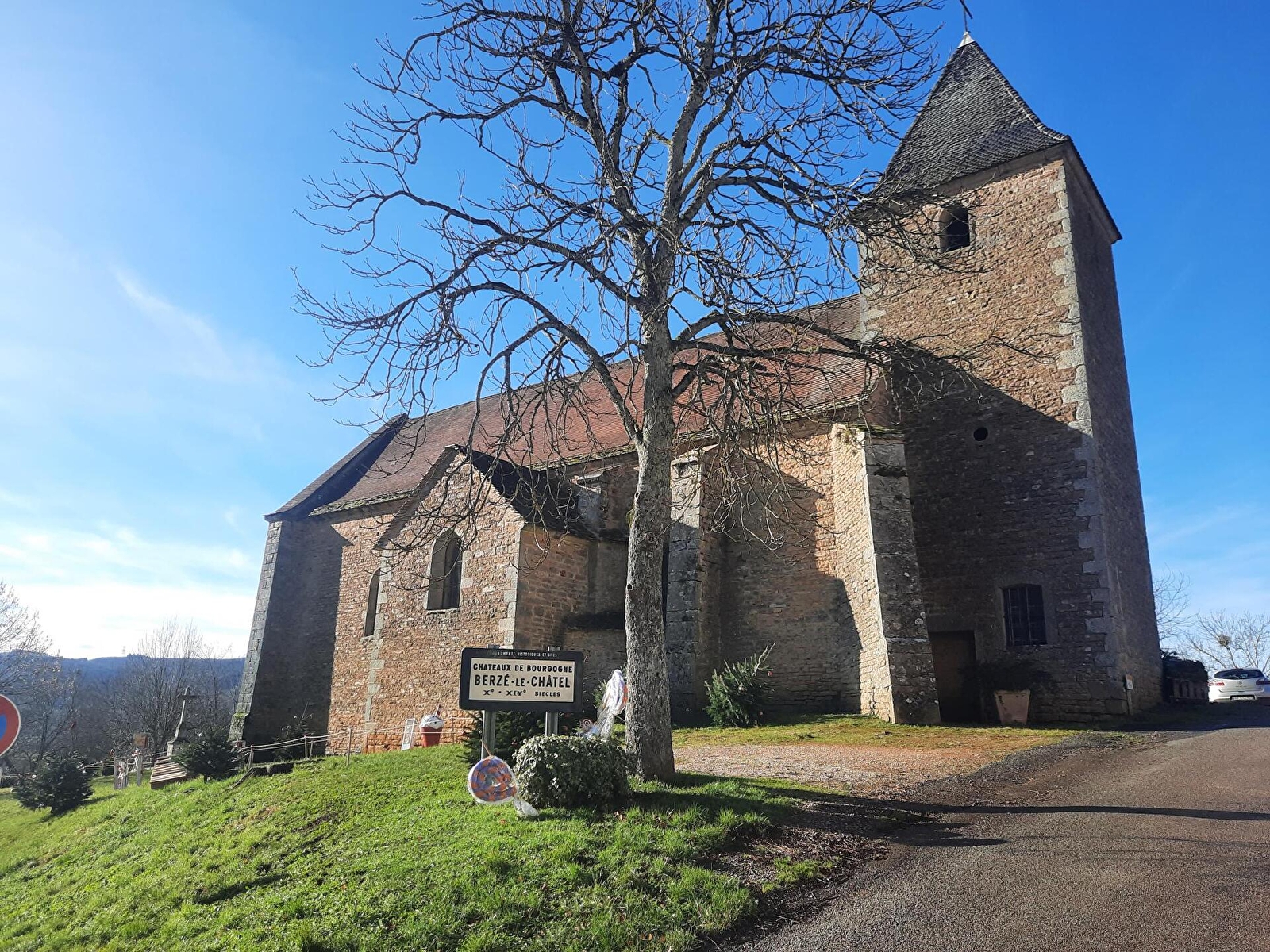 L’église est placée sous le vocable de Saint Sébastien et fut édifiée en 1739 (date visible dans le fond du chœur). Elle remplaça et faisait face à l’ancienne chapelle érigée au XVIe siècle qui servait d’église paroissiale et fut abandonnée puis démolie du fait de sa vétusté (emplacement de l’ancienne mairie-écoles). Du côté sud, l’église surplombe l’éperon barré fermé par la structure imposante du château médiéval de Berzé (Xe- XVe siècle, remanié au XIXe siècle).