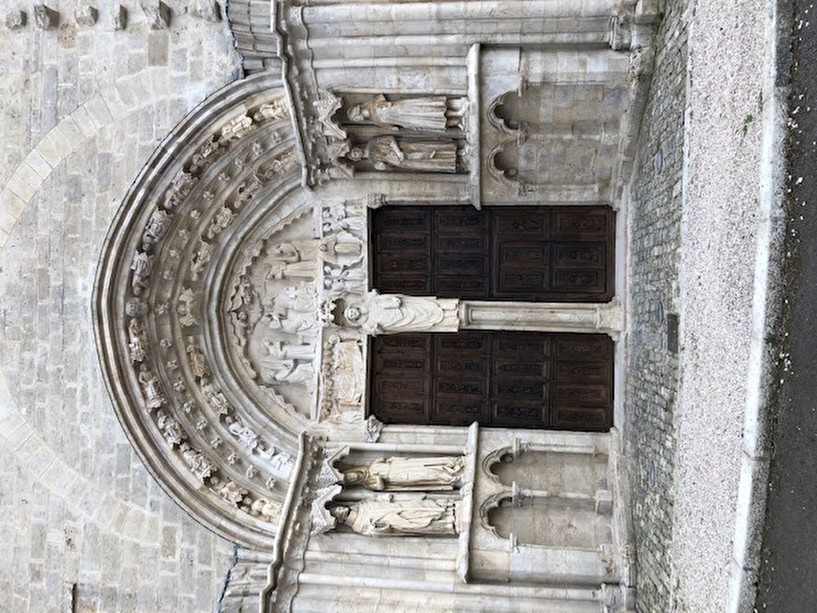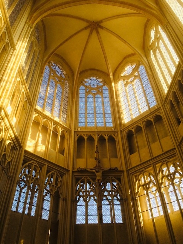 A l'intérieur, la blancheur de la pierre ciselée et la luminosité issue des hautes fenêtres lancéolées tranchent sur les sombres boiseries du XVIIIe siècle. qui habillent la nef.