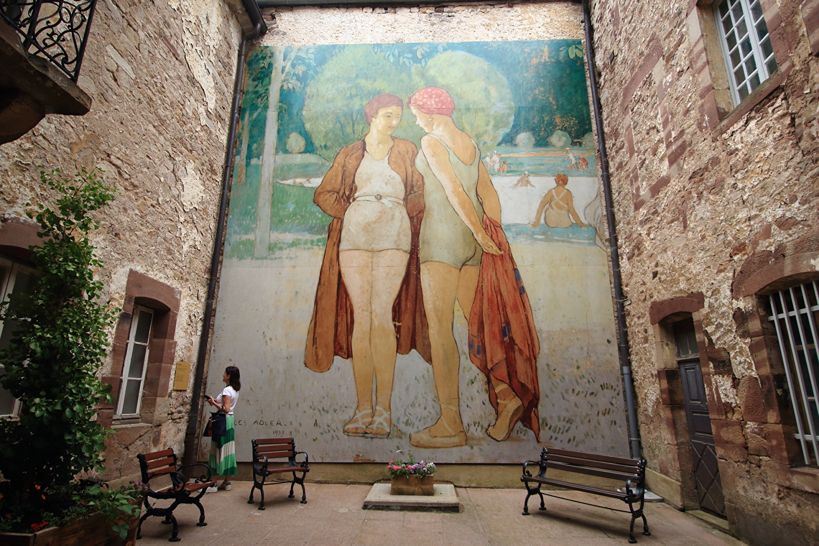 A ne pas manquer, la fresque dans le passage entre la place de la Baille et le parking de l’ex-MFR vous présente un détail de l’une des grandes toiles décoratives encore installées aux Thermes de Luxeuil. L’original est toujours visible dans le hall du pavillon ouest des Thermes.