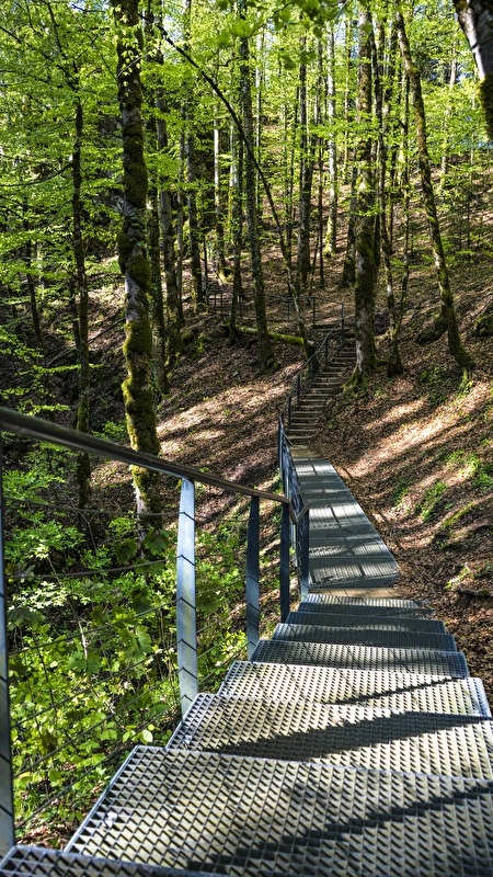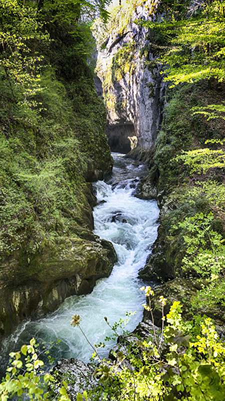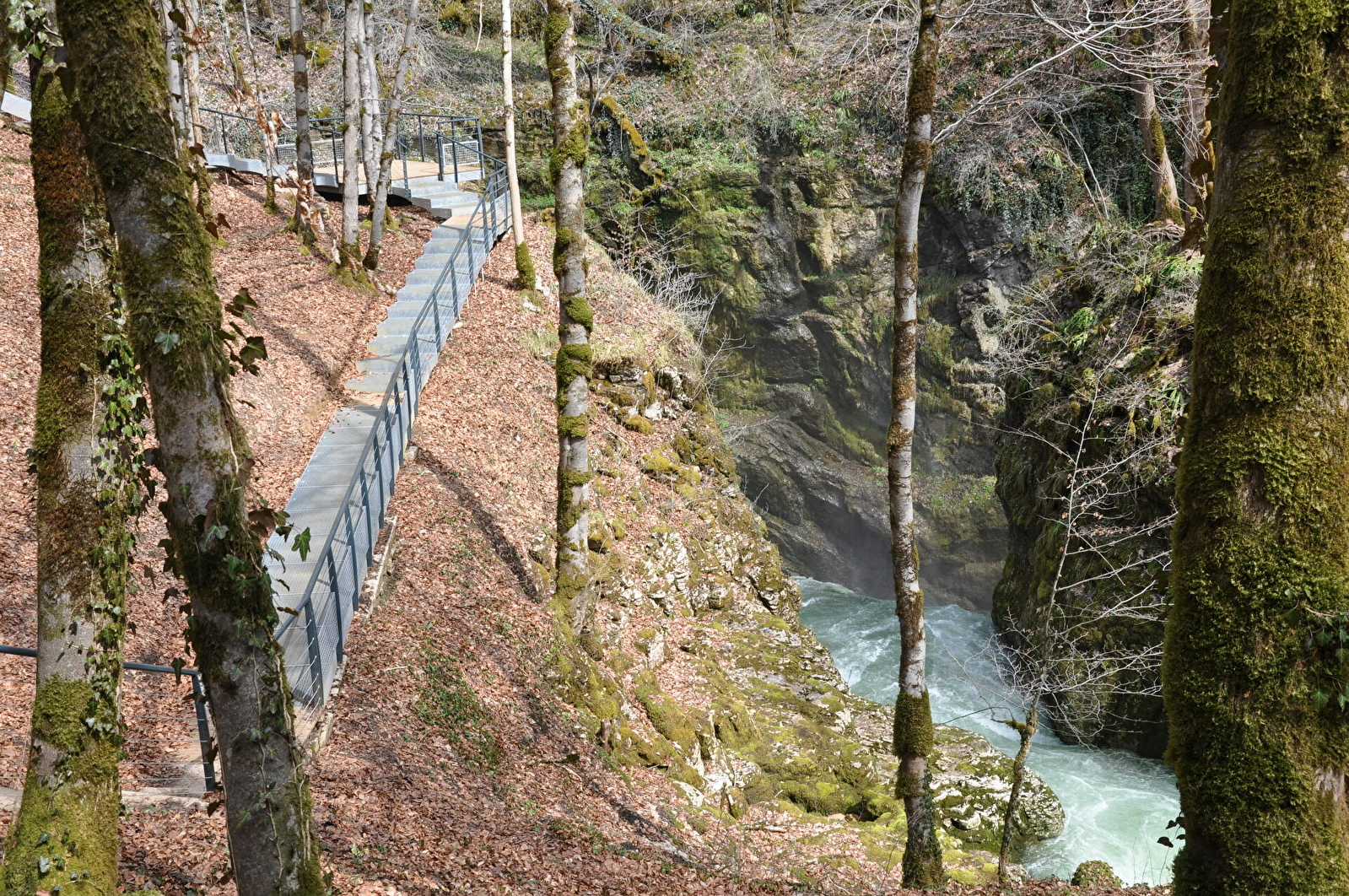Les gorges de la Langouette impressionnent par leur immensité et la singularité de leur décor sauvage. Parsemées de nombreux jeux de lumières éclairant mousses et fougères, qui foisonnent sous le couvert boisé, elles dégagent une atmosphère douce et sereine, où l’on aime particulièrement se ressourcer. Ce site préservé donne une vue privilégiée sur le travail de l’eau façonnant le canyon au gré de ses capricieux méandres. Tumultueuse et imprévisible, la petite Saine se joue de tous les obstacles pour poursuivre sa course avant de confluer avec l’Ain, quelques kilomètres plus loin.