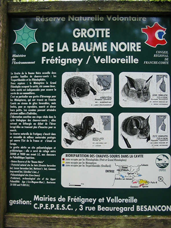 Située au sud du village de Fretigney, cette grotte très impressionnante est aujourd'hui classée Réserve Naturelle Régionale car elle constitue un habitat privilégié pour plusieurs espèces de chauve-souris. Son entrée constituée d'un grand porche de 27 m de large et 4 m de haut, est l'une des plus grandes de Haute-Saône. Attention, il est formellement interdit d'y pénétrer. Un panneau d'information est à votre disposition . Accessible par le sentier du circuit pédestre de la Baume Noire.