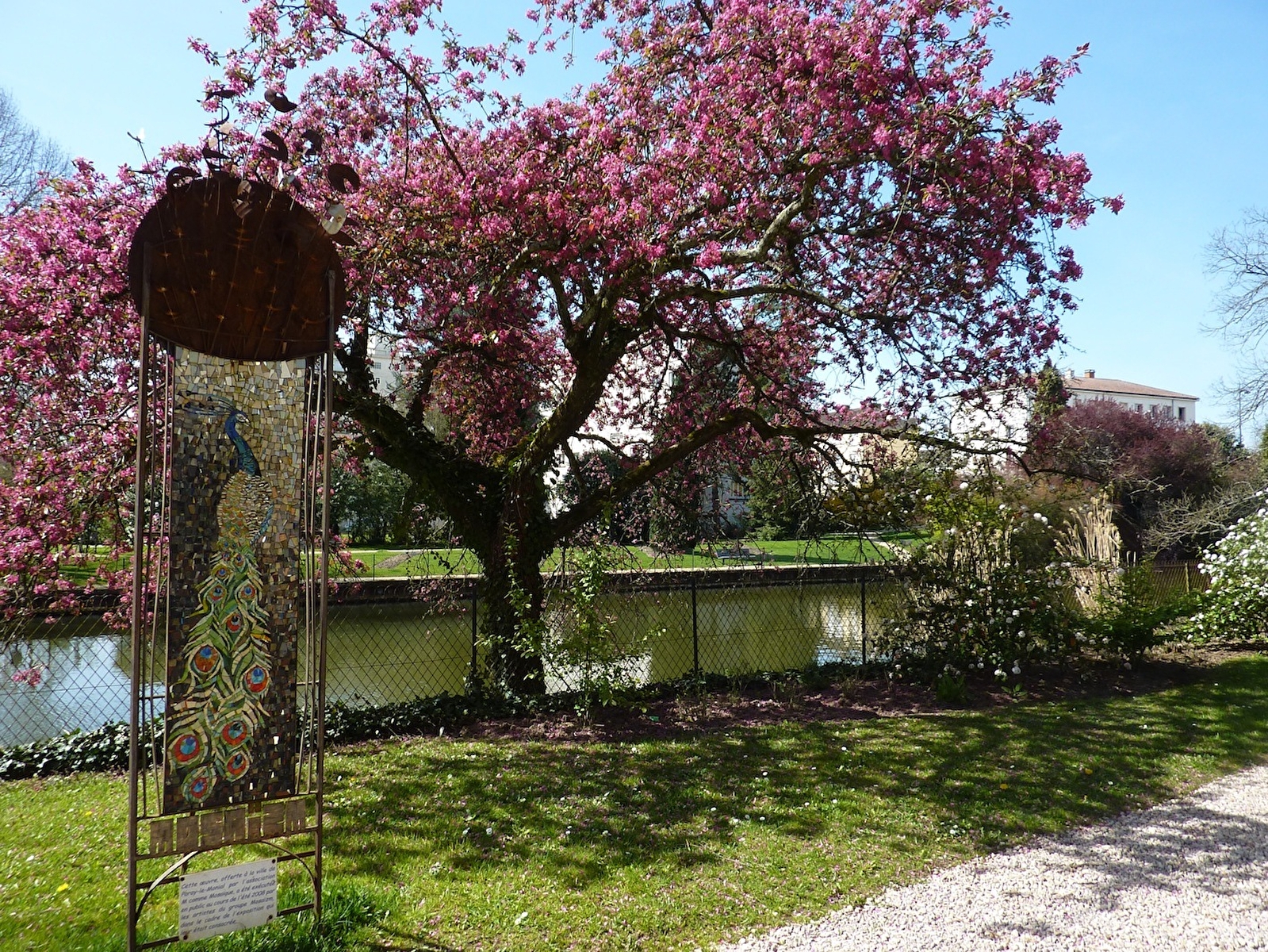 Au centre de ce jardin trône une mosaïque représentant un paon, emblème de la cité, œuvre du collectif Mozaïsm (2008).