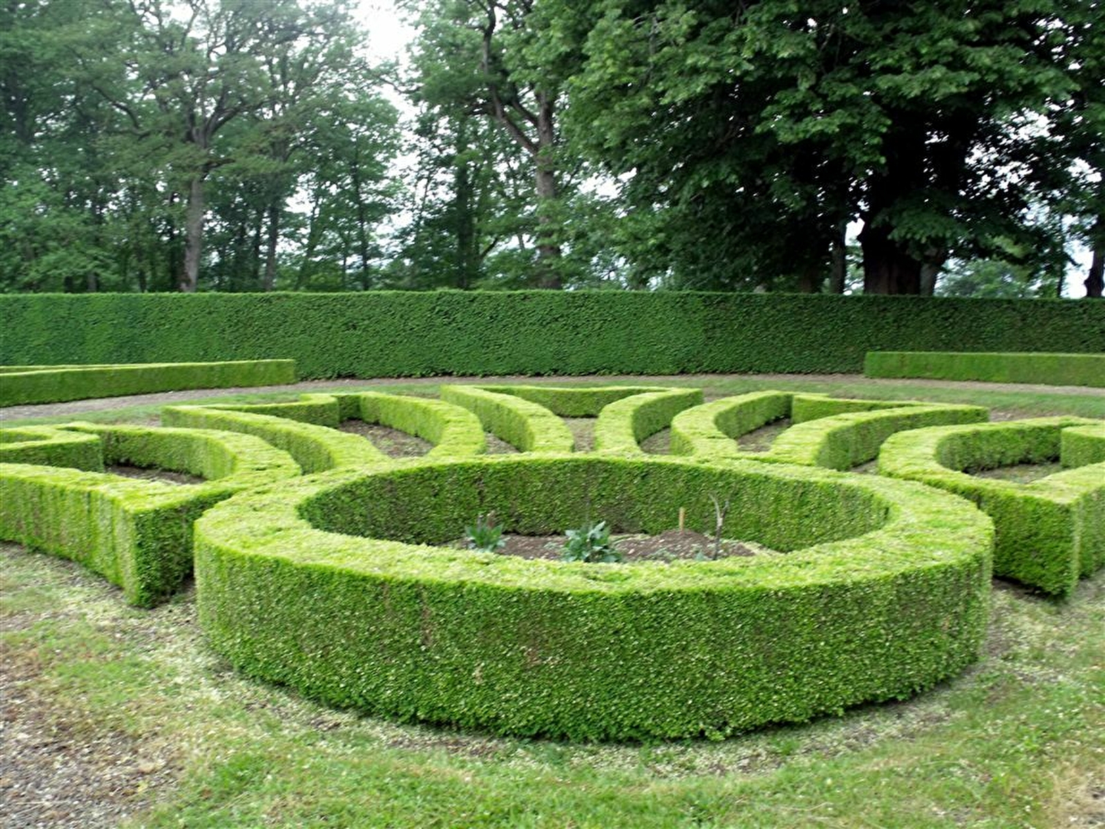 Dans un immense parc aux essences rares (fin du XIXème siècle) s'inscrit la terrasse du château sur laquelle prennent place un jardin régulier à la française délimité par des allées de buis, une grande charmille et un jardin potager qui a gardé toutes ses structures essentielles : bassins, allées couvertes d'arbres fruitiers en espalier, gloriettes, grotte et serre. Collection de pivoines et roses anciennes.