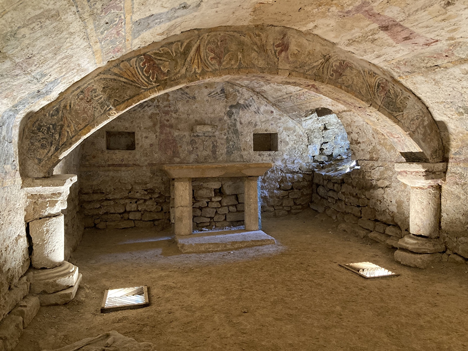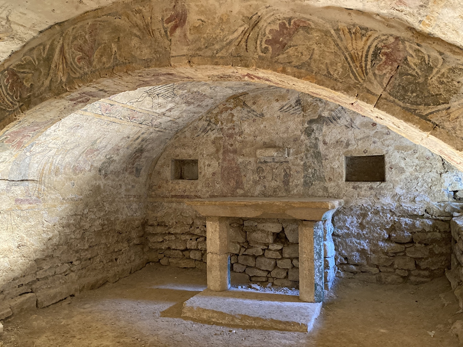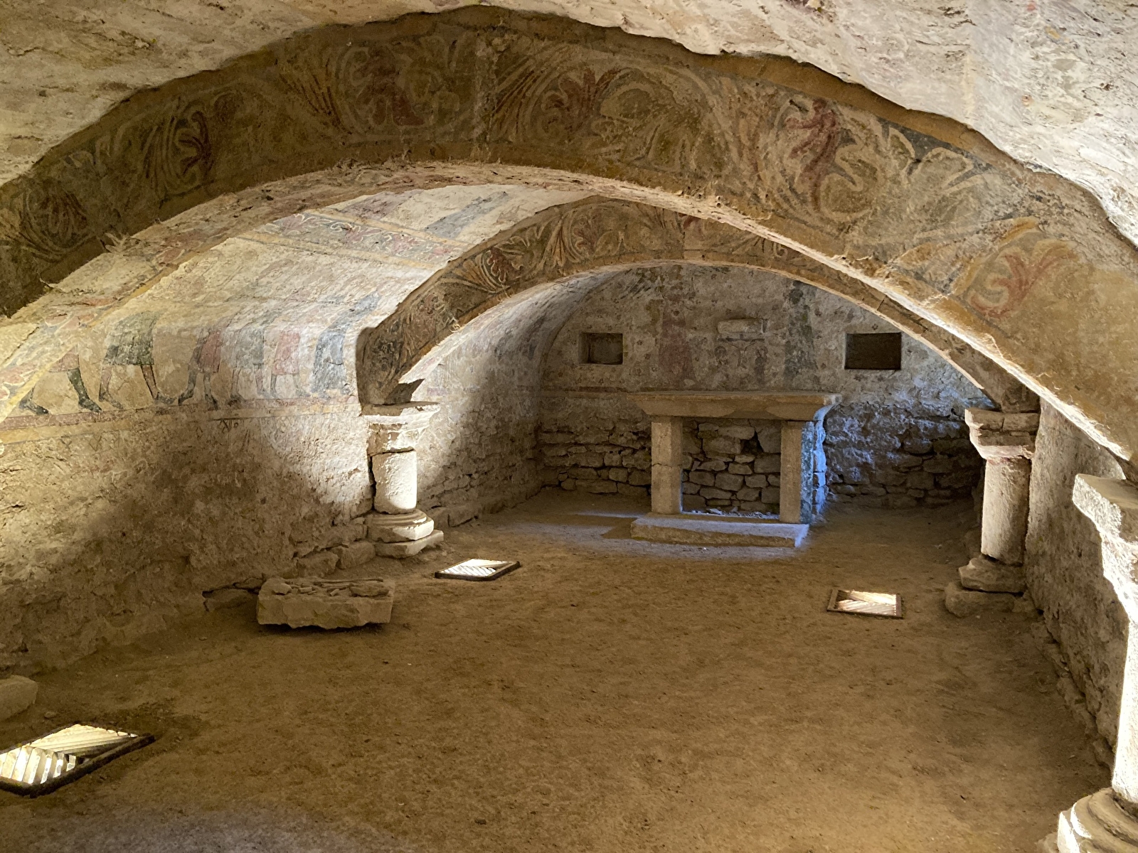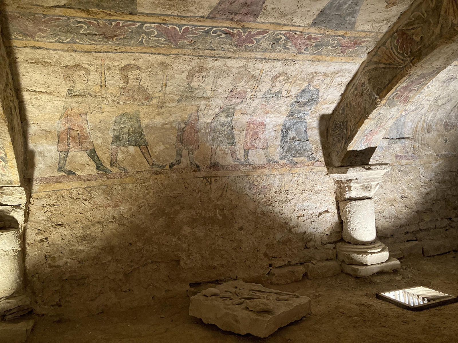 On y trouve donc trois niveaux de décoration de facture simple composant une procession. L’abondance des personnages portant des cierges rappelle que ce lieu sombre et souterrain est dédié à la lumière. Deux scènes sont consacrées à la crucifixion (mur Est) et au Christ triomphant, vainqueur de la mort.