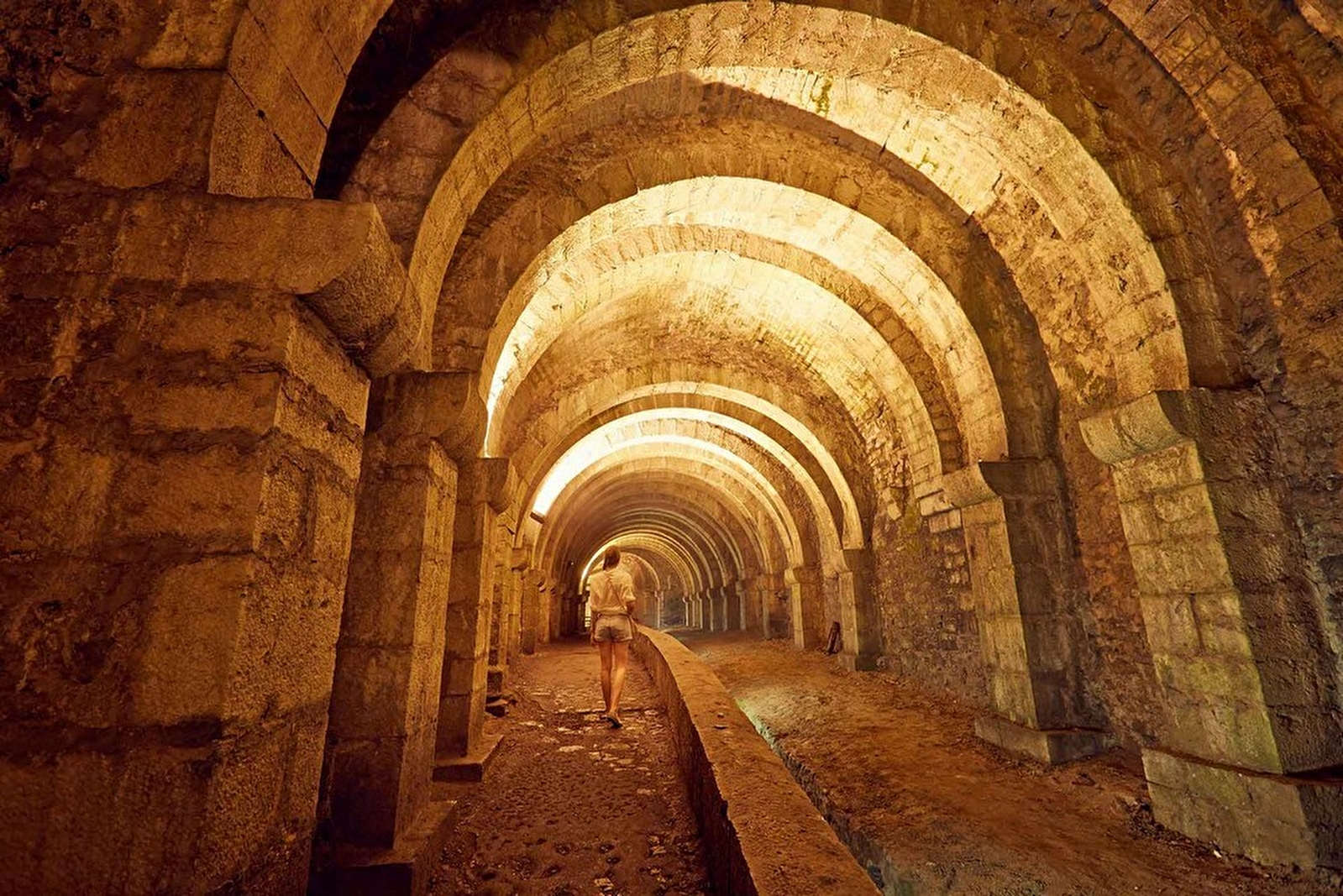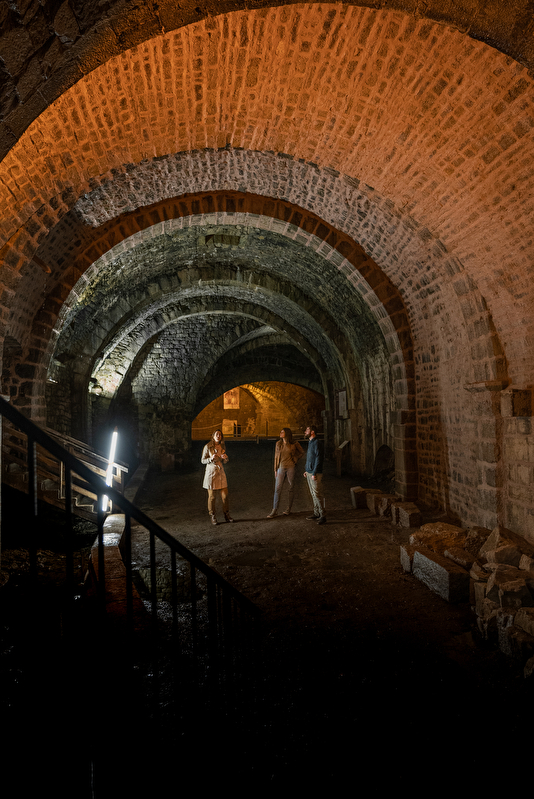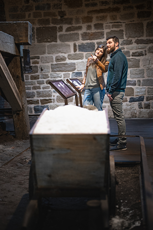 Au début de votre visite, la descente dans les puits d’extraction d’eau salée vous dévoilera les secrets des techniques de l’extraction du sel. Près de 165 mètres de galerie voûtée datant du XIIe siècle, dont les dimensions se rapprochent de celles d’une cathédrale, s’étaleront devant vos yeux. Des profondeurs jaillit un bruit d’eau provenant de la roue à augets, en état de marche depuis le XIXe siècle. Cette roue entraîne un balancier de plus de 32 mètres long avec une pompe permettant d’extraire l’eau salée du sous-sol. La galerie est uniquement accessible en visite guidée, pour des raisons de sécurité.
