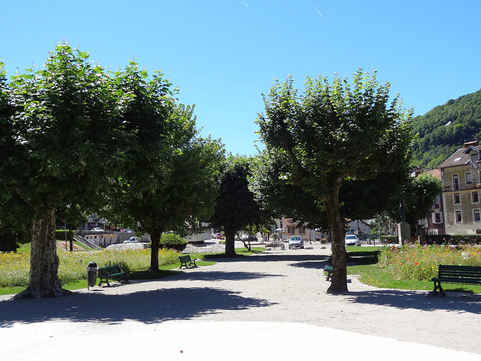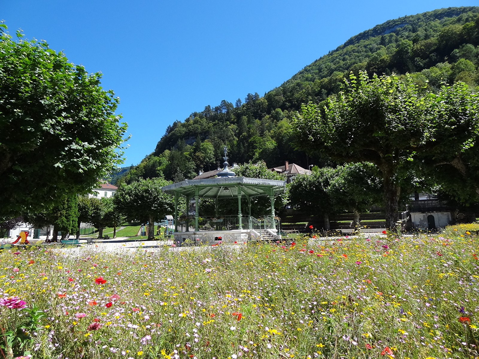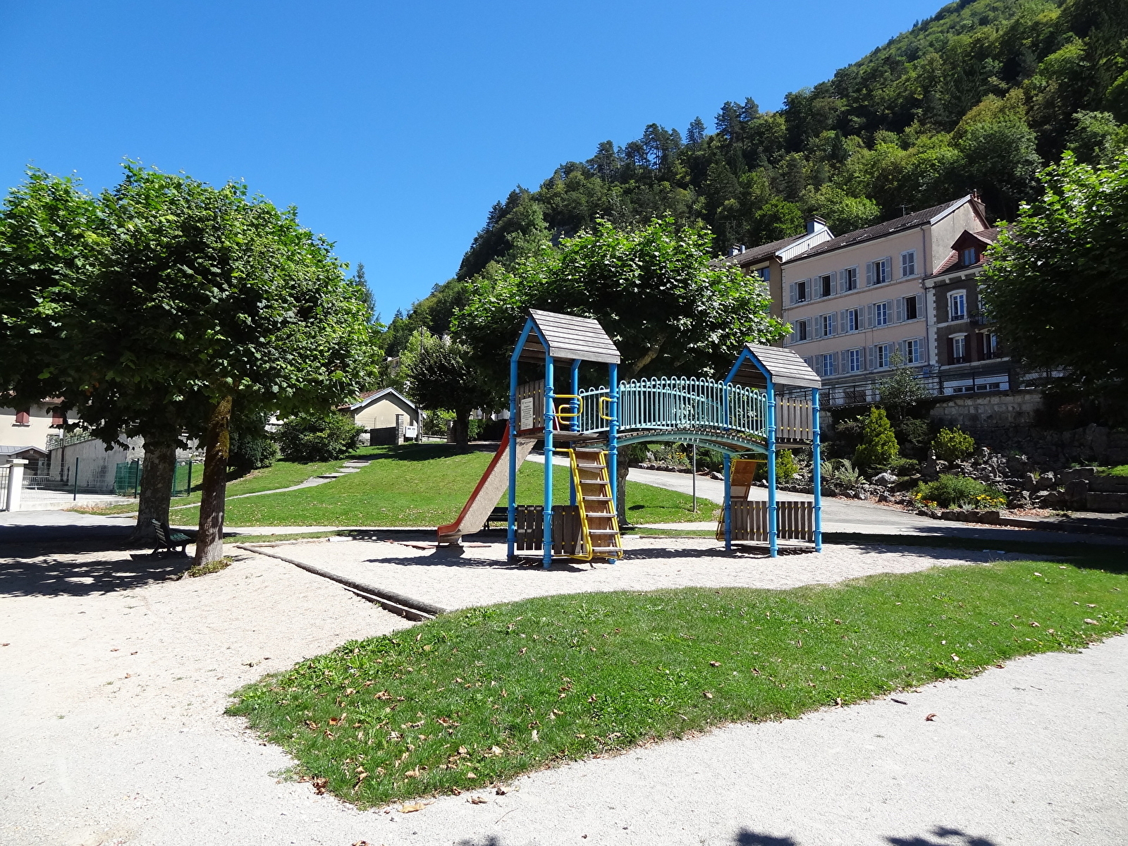À Saint-Claude, à proximité des commerces, les vastes pelouses ombragées et les bancs accueillants du parc vous offrent un cadre idéal pour vous détendre, tandis que l'aire de jeux à proximité ravira les enfants.