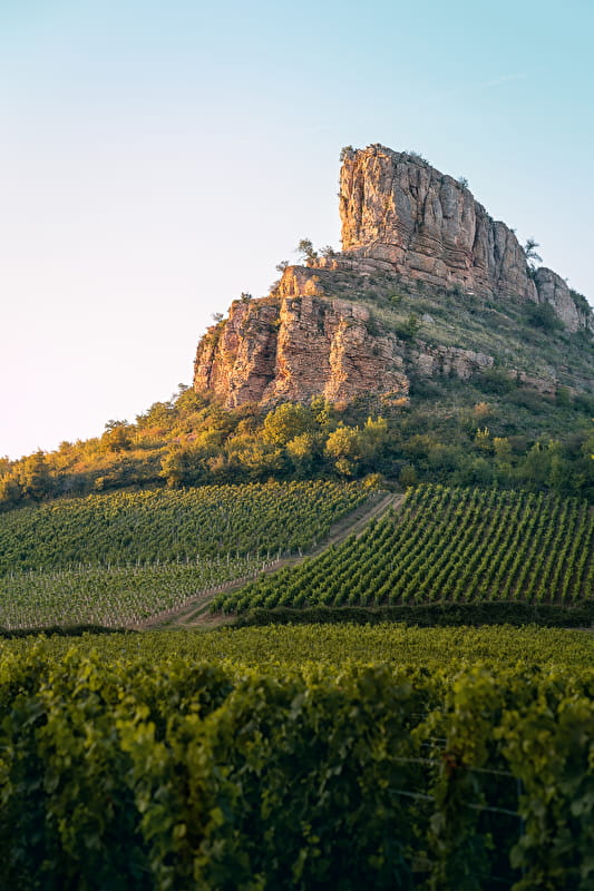 Point de vue incontournable à ne pas manquer. Sur le Grand Site de France Solutré Pouilly Vergisson, la Roche de Solutré culmine à 493 mètres. Spectaculaire escarpement calcaire, au milieu des vignobles du Mâconnais. Les roches de Solutré-Pouilly, Vergisson et le Mont Pouilly font partie de l'élite des Grands Sites de France. Situé à l’extrême sud de la Région Bourgogne Franche-Comté, le Grand Site de France Solutré Pouilly Vergisson est un espace naturel protégé et un site touristique renommé. C’est également le lieu de promenade préféré des Mâconnais. Le territoire du Grand Site de France Solutré Pouilly Vergisson s’étend sur six communes :