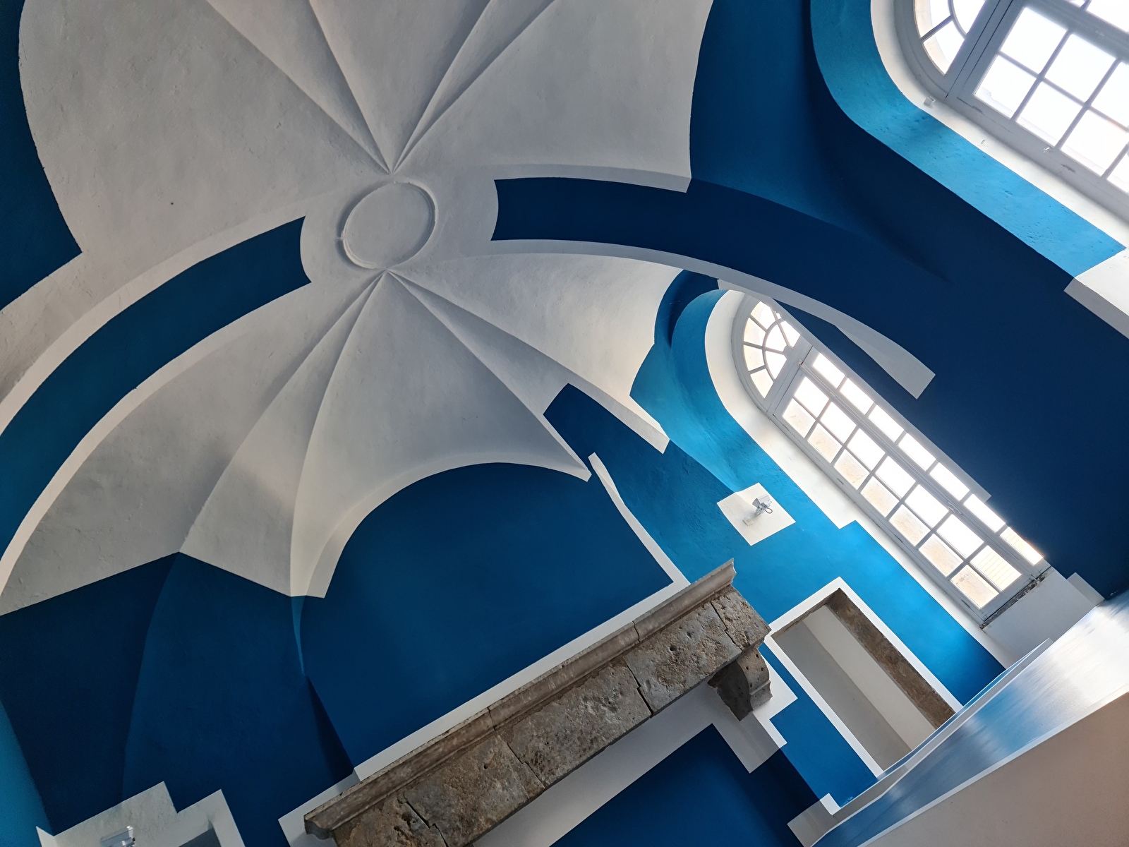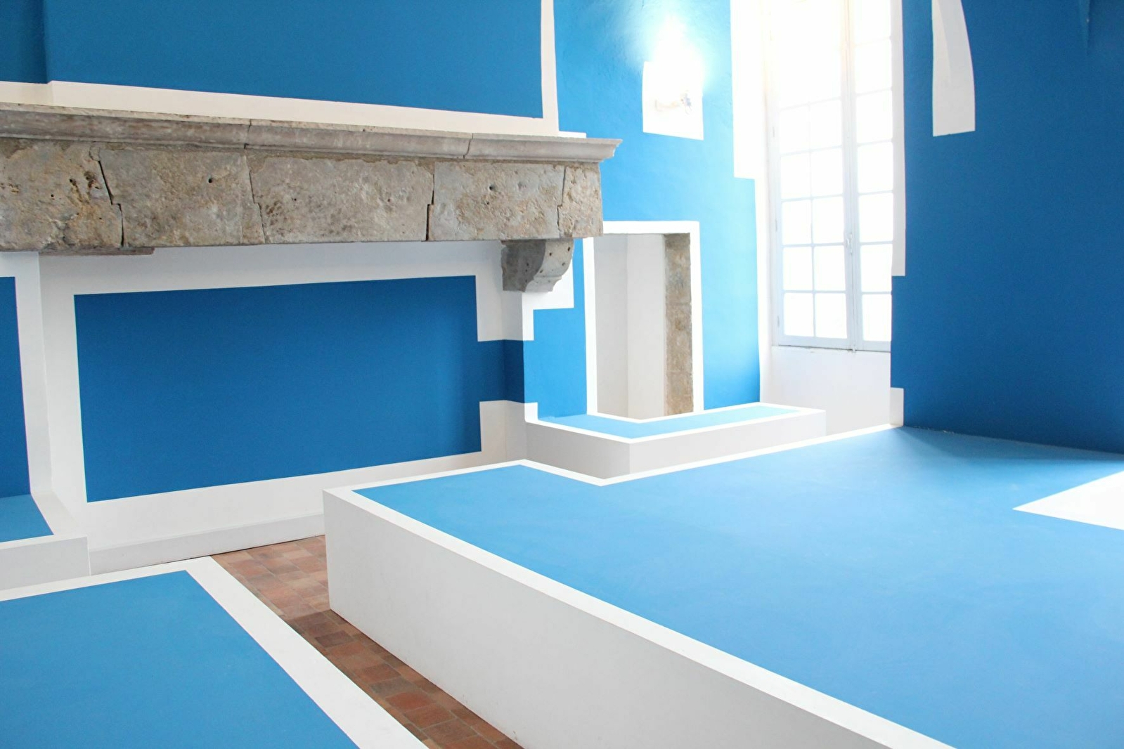 À l’initiative de la ville de Corbigny et en partenariat avec le Parc-Saint-Léger - Centre d'art contemporain de Pougues-les-Eaux qui n'existe plus aujourd'hui, le projet de Krijn de Koning réalisé spécifiquement pour l’Abbaye de Corbigny prend en compte les particularités de l'ancienne cuisine du monastère. Comme habituellement dans son travail, en France et à l’étranger, l’artiste repère les spécificités d’un espace et met en jeu des volumes qui en accentuent certains détails architecturaux. Une peinture murale réunit l’ensemble en épousant la forme d’une partie des voûtes, un peu comme une fleur qui se déploie sur les murs. L'œuvre intitulée : Omvang, Omgang, jeu de mots néerlandais difficilement traduisible, relie à la fois l’architecture et la déambulation du public, et dans sa version française devient « tour et détour ». Work for the Abbaye de Corbigny (blue) incite le visiteur à arpenter l’architecture en vivant une expérience inhabituelle qui l’engage à poser un autre regard sur le patrimoine.