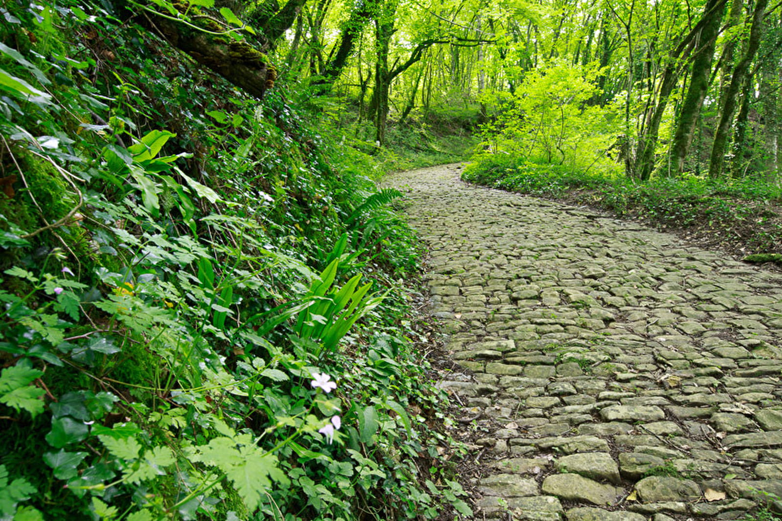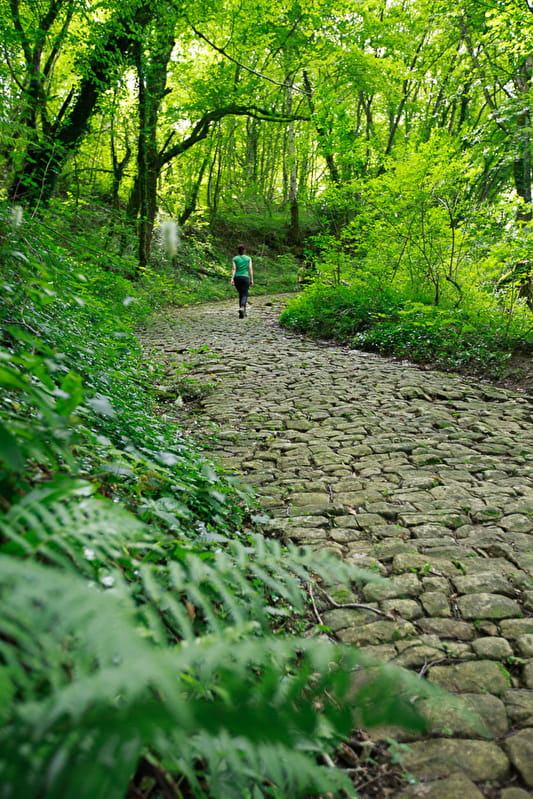 Les voies romaines du Revermont permettaient de faire la liaison entre différentes villes et agglomérations antiques proches (Bourg-en-Bresse, Coligny, Lons-le-Saunier). Cet édifice a fait l’objet d’une vaste campagne de restauration dans les années 80 menée par des bénévoles et primée par le 8ème prix de l’environnement du petit patrimoine par Simone Veil. Marquée par deux mille ans d’histoire, cette restauration nous permet encore aujourd’hui de marcher sur les pas de nos ancêtres ! Vous pouvez découvrir les traces laissées par le passage des roues dans les pavés et profiter du chemin ombragé qui conduit au belvédère de Montagna.