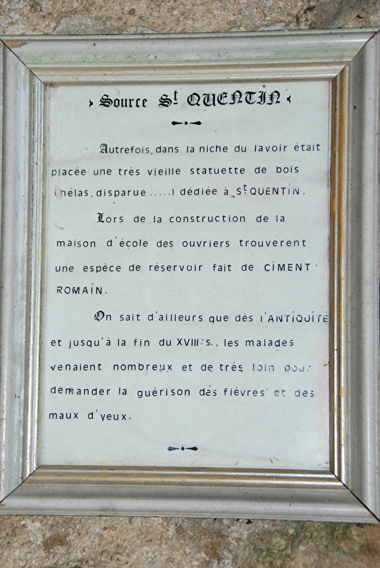 Lavoir et Fontaine de Saint-Quentin. Source réputée depuis très longtemps pour guérir les fièvres et certaines maladies des yeux. Au bas du village, dans un bouquet de verdure, la source de Saint-Quentin libère des eaux claires qui iront rejoindre la rivière vers Pont d'Ouche.