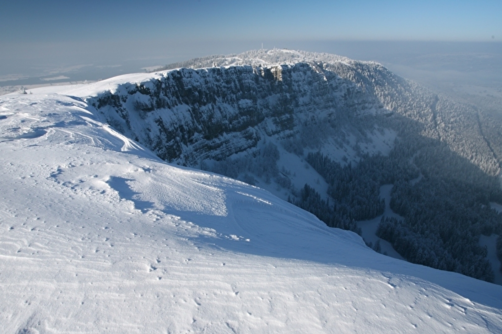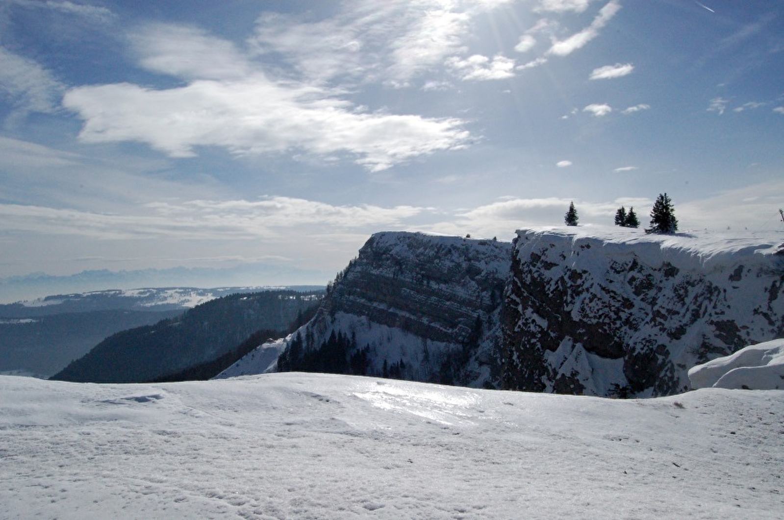 Point culminant de la station de Métabief : 1463m. Falaises rocheuses avec vue panoramique sur la chaîne des Alpes et plaine Suisse.