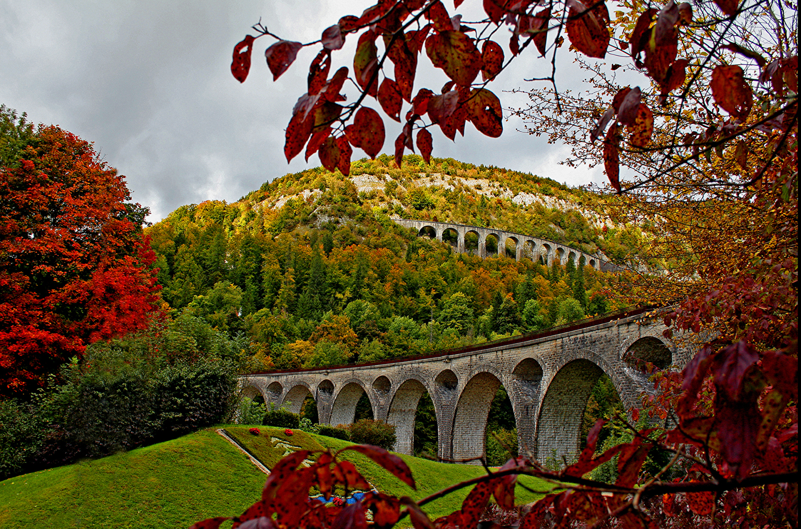 Inauguré en 1900, le tronçon de ligne entre Champagnole et Morez a nécessité la construction de pas moins de six viaducs, dont trois à flanc de montagne et trois tunnels pour relier les deux gares de Morbier ( à 861m d’altitude) et Morez ( à 736m d’altitude).