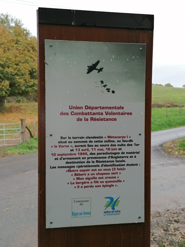 Les parachutages de Rigny-sur-Arroux eurent lieu sur le terrain "Métacarpe I" le 1er et 13 avril, 11 mai, 16 juin et 10 septembre 1944.