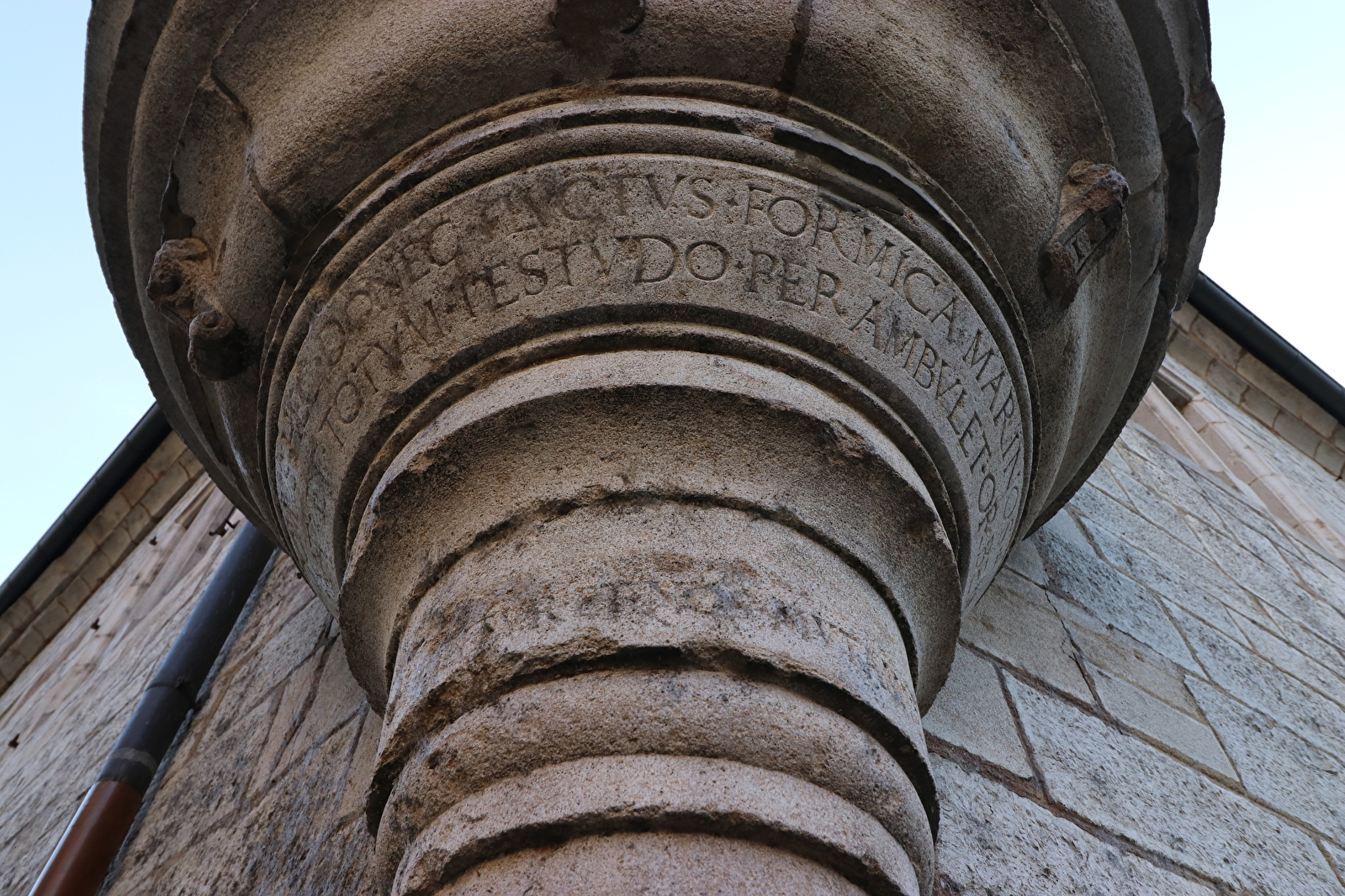 Elle attire le regard par cette tour en encorbellement qui porte sur sa partie inférieure des inscriptions latines :