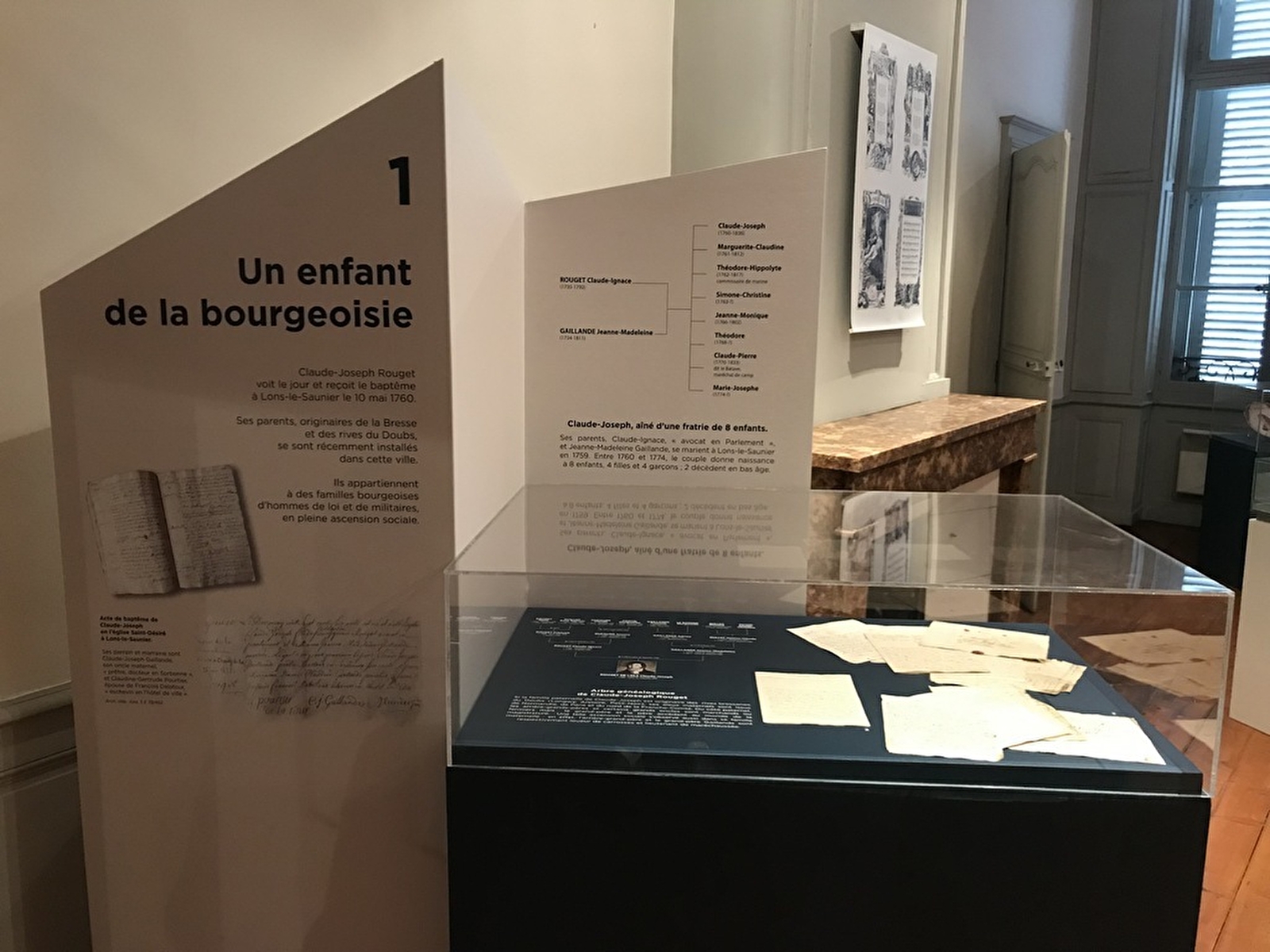 Les documents et les objets mis en scène dans la première pièce rappellent la biographie de Claude-Joseph Rouget de Lisle : ses origines et son enfance, ses études et sa courte carrière militaire, l’écriture de La Marseillaise, son œuvre artistique (textes, musiques, entre autres), ses dernières années partagées entre le Jura et la région parisienne.