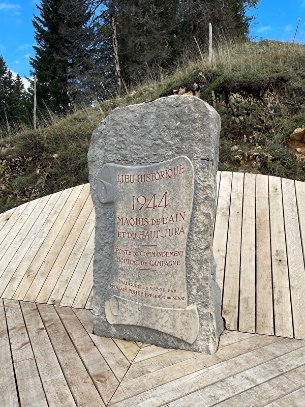 Ce monument, à la limite des deux départements de l’Ain et du Jura, est le symbole de l’importance de cette organisation et du rôle joué par les agents de liaison. Site refuge situé au pied du crêt de Chalam, il fut choisi pour sa difficultés d’accès par les troupes allemandes motorisées. En juillet 1944, le groupement nord du maquis de l’Ain et du Haut-Jura, sous la direction de Noël Perrotot, y installa son poste de commandement et un hôpital de campagne. 3 000 maquisards se replièrent dans les environs et y restèrent près d’un mois avant de repartir au combat. Le site de la Borne au Lion doit son nom à une borne en pierre apposée après le traité d’Auxonne (1612) signé entre les royaumes de France et d’Espagne fixant la frontière entre le Bugey (français) et le comté de Bourgogne (espagnol) représenté par le lion gravé sur une face de la stèle.