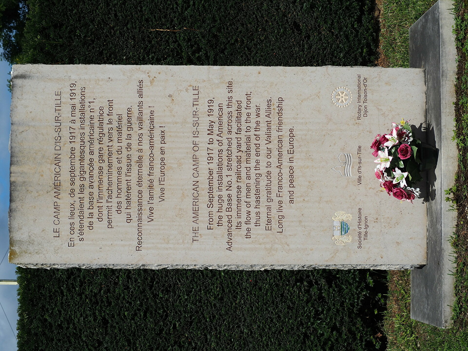 Pour chaque soldat américain débarqué, 10 tonnes de matériels suivaient, ce qui a eu des conséquences sur l’organisation du camp. L’armement, les habits militaires et la nourriture étaient envoyés à la demande à la gare régulatrice américaine d’Is-sur-Tille depuis les bâtiments de stockage. La gestion des dépôts avancés était gérée par le Génie américain. Les soldats du Génie commencèrent la construction du camp dès septembre 1917 qui sera terminée en mars 1918. Ce camp s’étendait sur près de 300 hectares et comprenait des entrepôts répartis le long de 13 km de voies ferrées étroites et 95 km de voies ferrées normales. Une boulangerie servait également à nourrir tous les soldats américains : sa capacité de production était de 365 tonnes de pains par jour. Une centrale électrique de deux turbines de 500 kW fournissait l’énergie. À Is-sur-Tille, nous pouvons voir des vestiges nous rappelant la présence américaine des soldats sur le territoire : la cheminée restaurée (vestige du bâtiment du foyer des officiers) et des réservoirs situés sur un coteau à proximité de la RD 959. Pour commémorer la présence de l’armée américaine une stèle a été érigée dans la zone industrielle.
