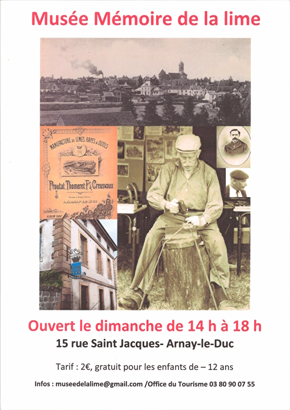 L’Association Mémoires de la Lime vous invite à replonger à cette époque et à découvrir le travail des tailleurs de limes d’Arnay le Duc : Panneaux explicatifs, projection d’un film, photos, objets, machines …. Vous saurez tout sur cette entreprise qui a employée jusqu’à 500 personnes et leur savoir-faire.